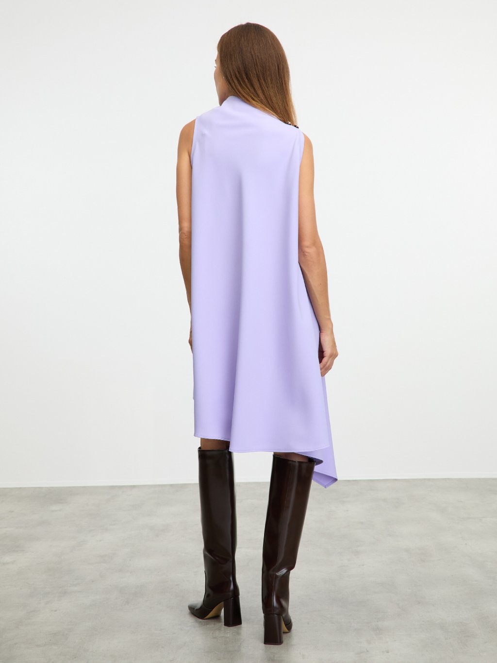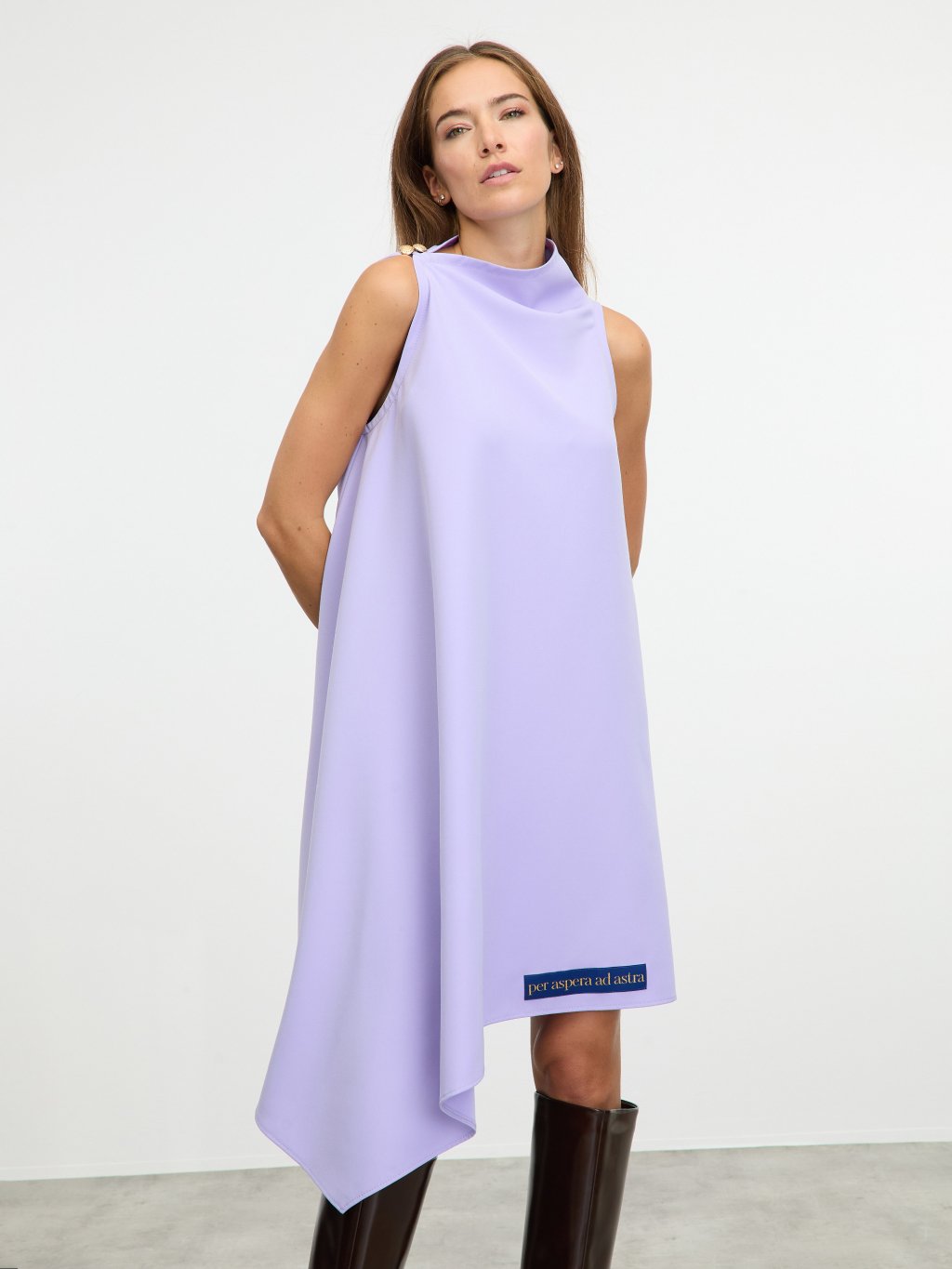 Stylové asymetrické šaty s ozdobnými knoflíky na ramenou.