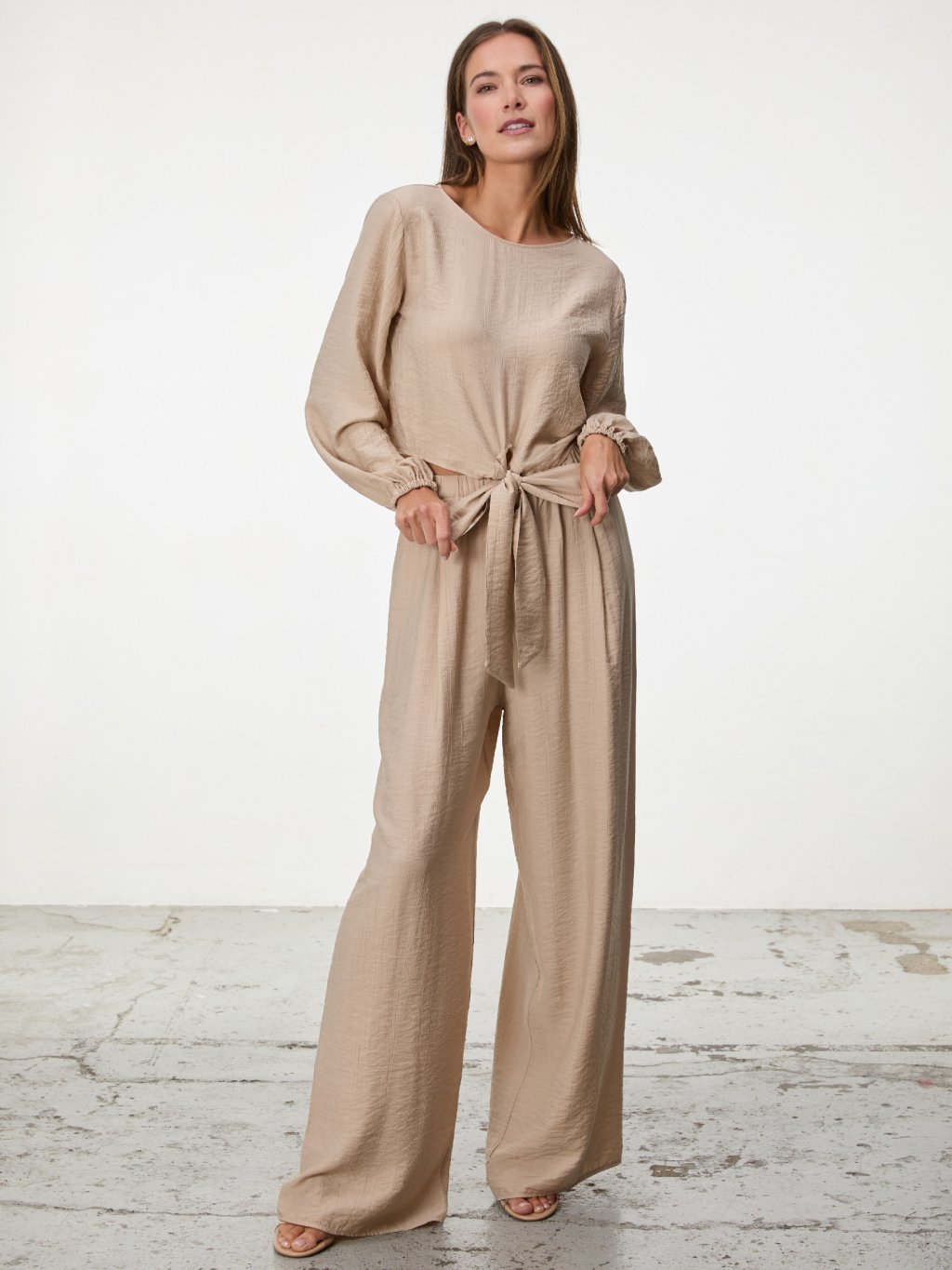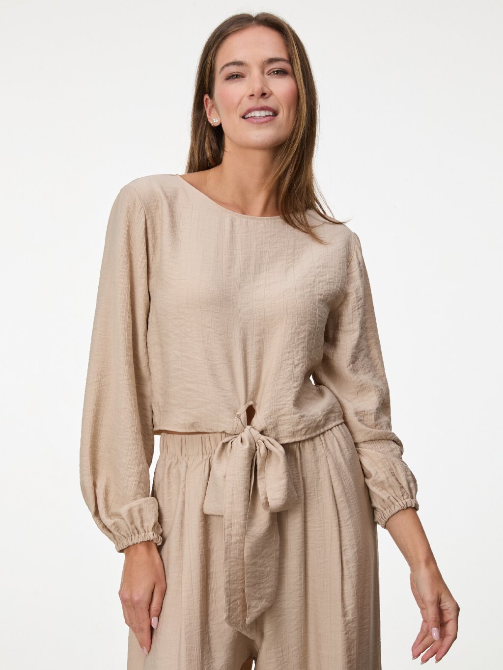 Dlouhá mašle umožňuje přizpůsobit siluetu podle potřeby a dodává modelu ženskost i nenucenou eleganci.