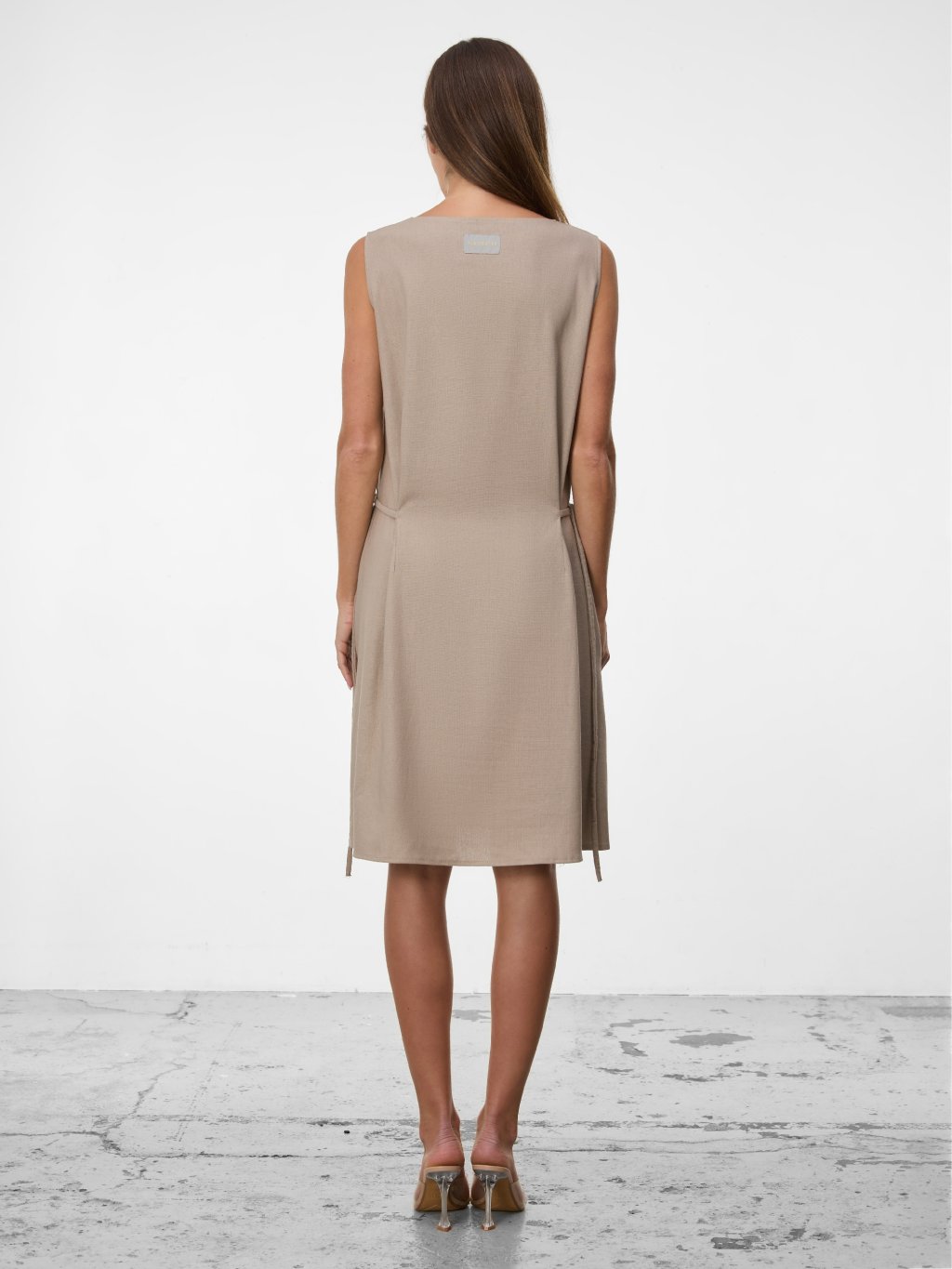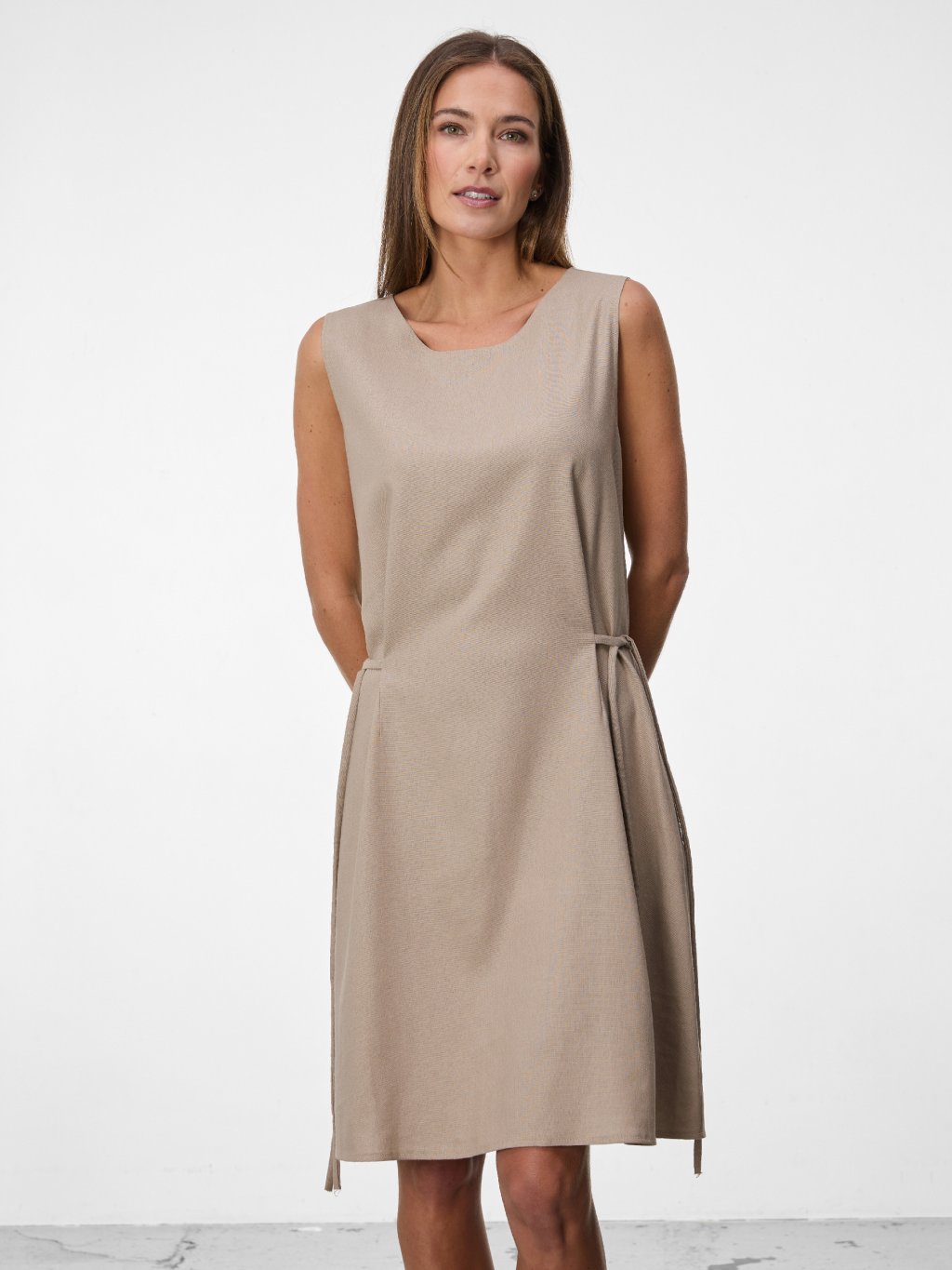 Čistá silueta šatů Calma bez rukávů působí elegantně a minimalisticky, zatímco jemné sklady a vázání v pase dodávají modelu lehkost a ženský tvar.