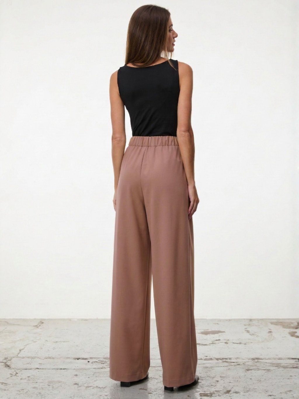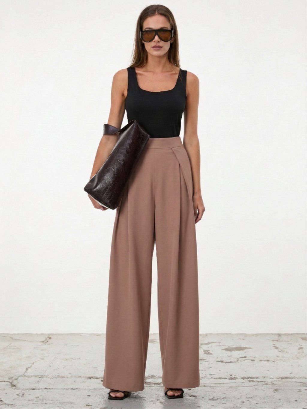 Elegantní široké kalhoty SIMPO v odstínu cappuccino. Volná silueta se širokými nohavicemi přirozeně prodlužuje postavu a vytváří sofistikovaný, uvolněný vzhled.