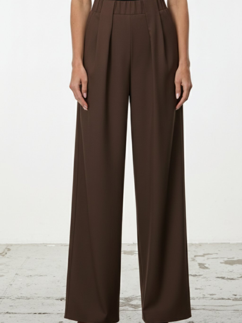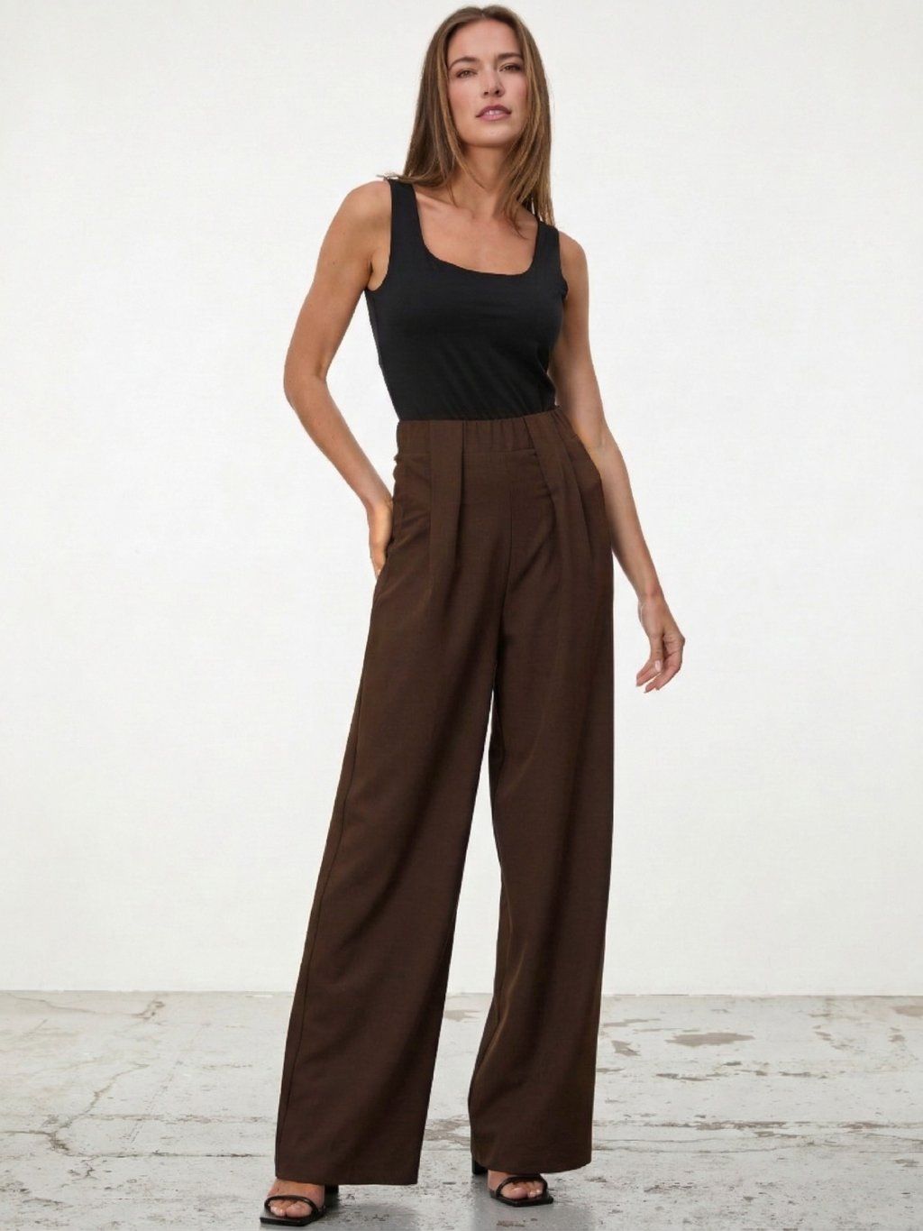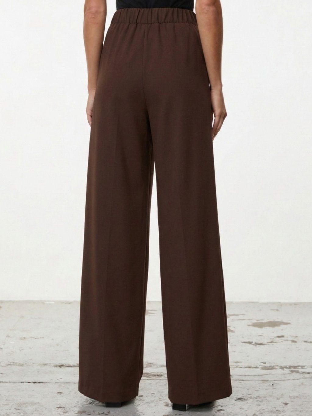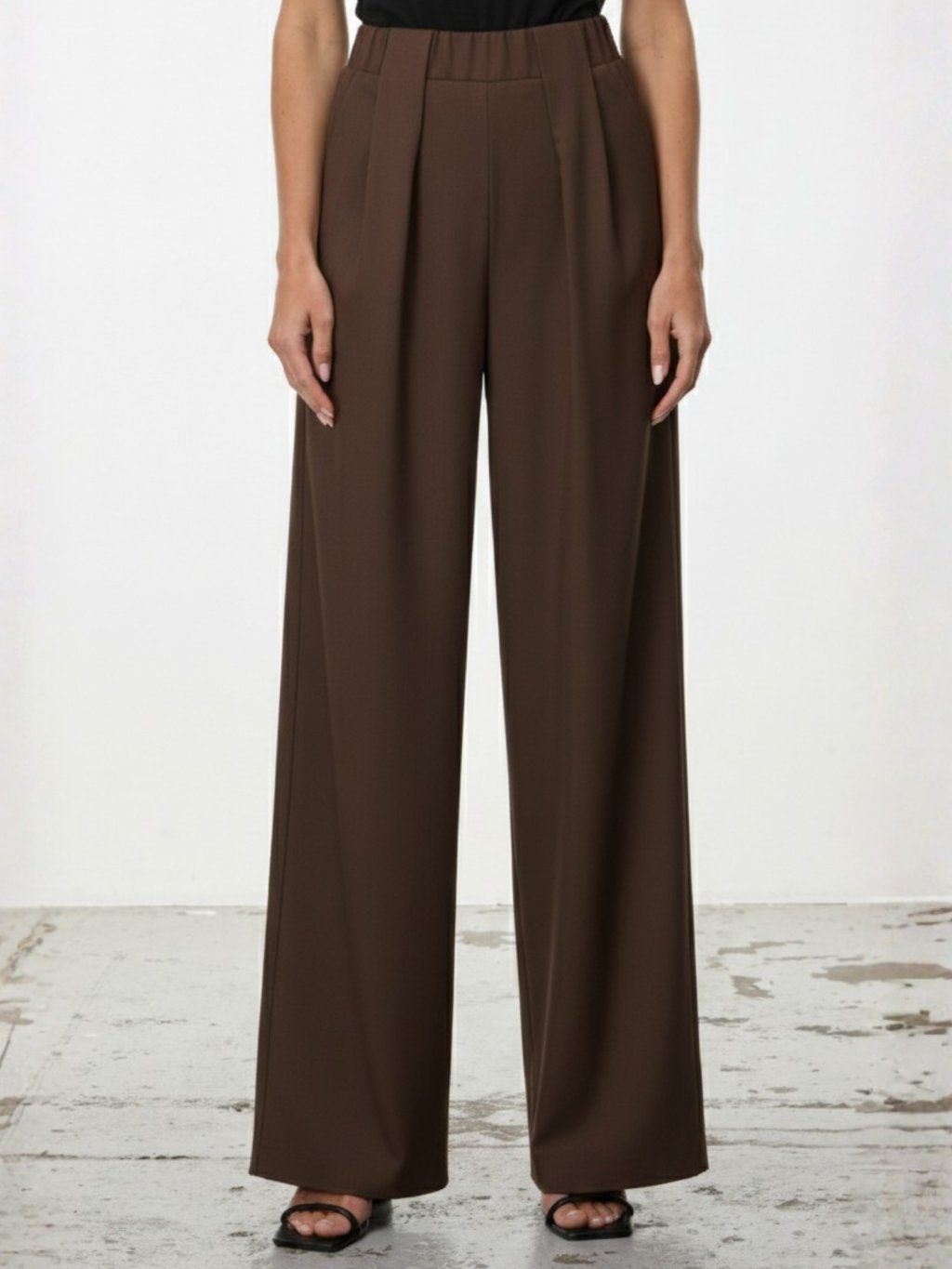 Minimalistické široké kalhoty v čokoládově hnědém odstínu, které spojují čistý design s maximálním komfortem. Vysoký pas s jemným řasením a výraznými sklady v přední části vytváří strukturovanou siluetu a přirozeně prodlužuje postavu. V pase jsou na gumu. Všimněte si výrazných a velmi efektních poutek na pásek.