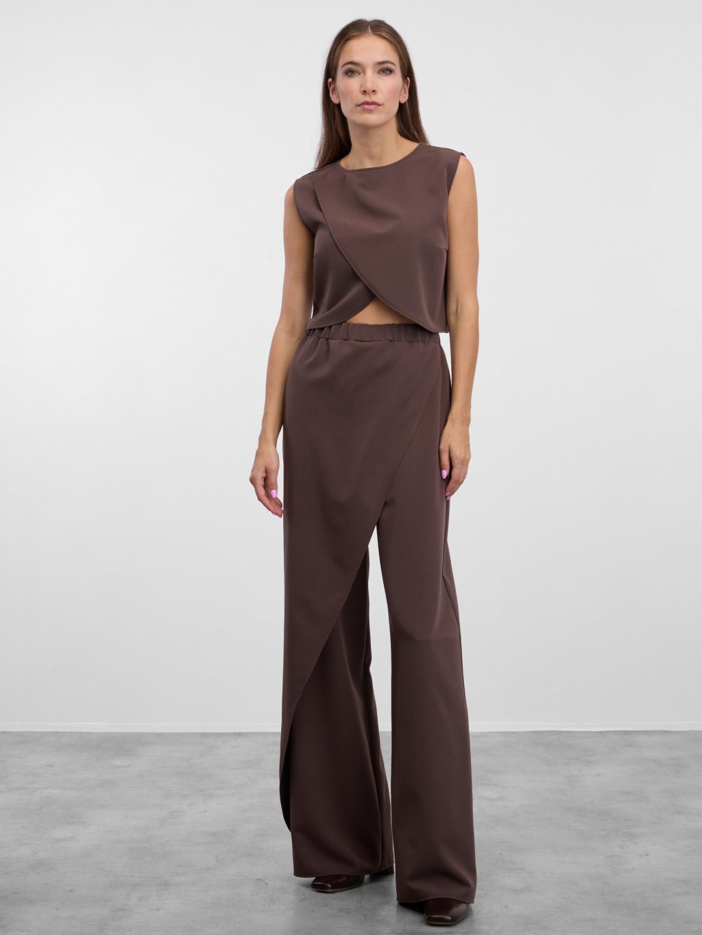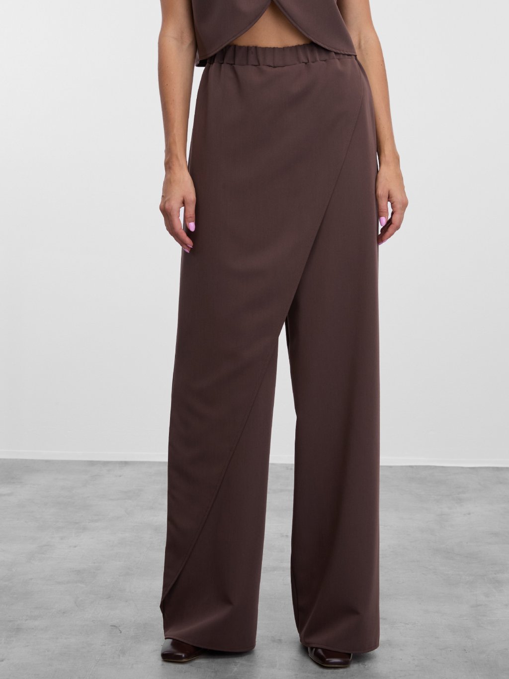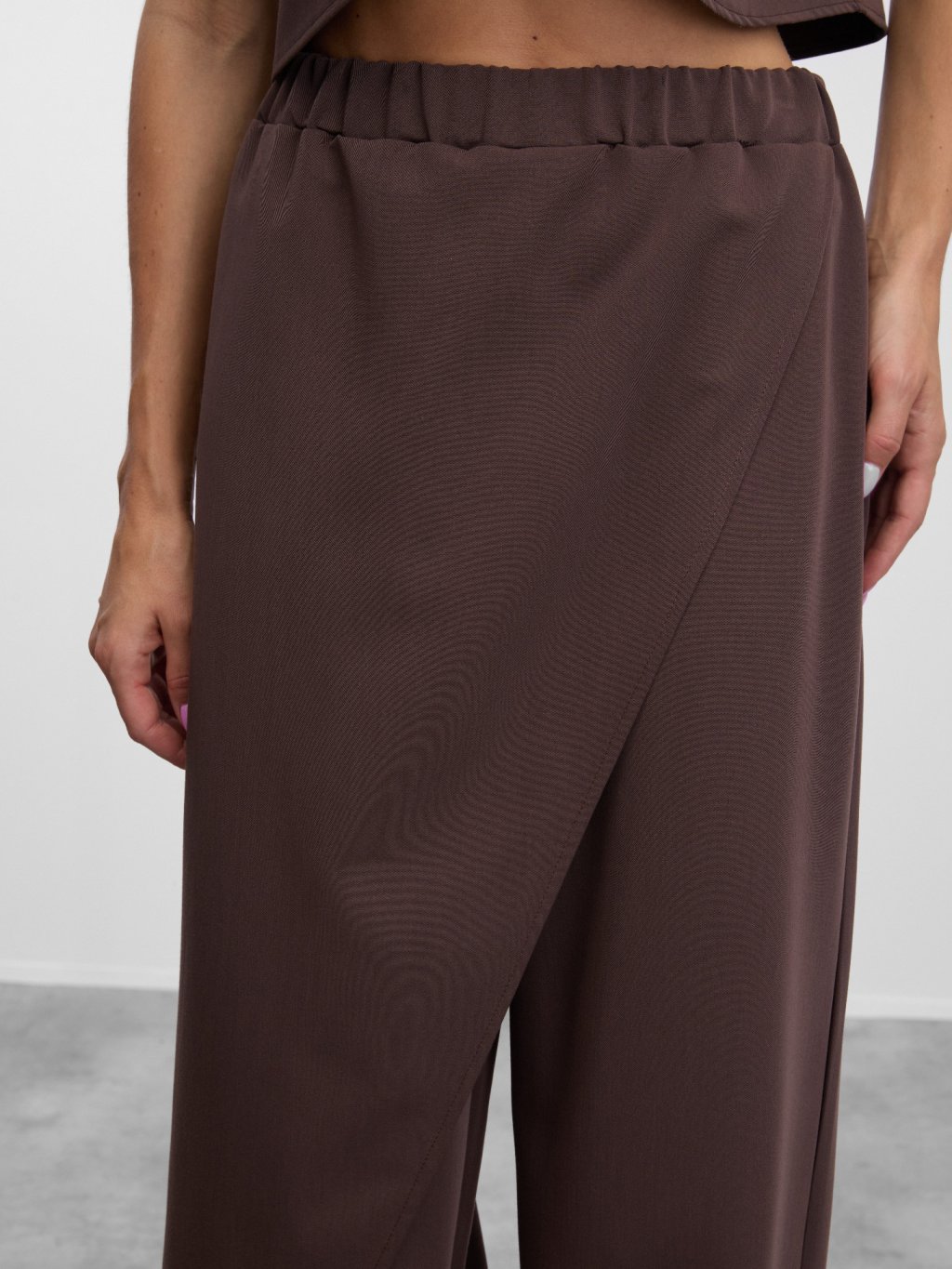 Kalhoty Sijonas s asymetrickou sukní vpředu v teplé hnědé barvě.