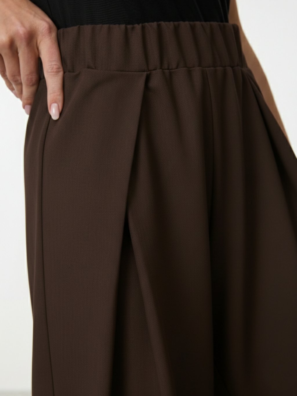Elegantní široké kalhoty SIMPO v čokoládově hnědém odstínu. Volná silueta se širokými nohavicemi přirozeně prodlužuje postavu a vytváří sofistikovaný, uvolněný vzhled.
