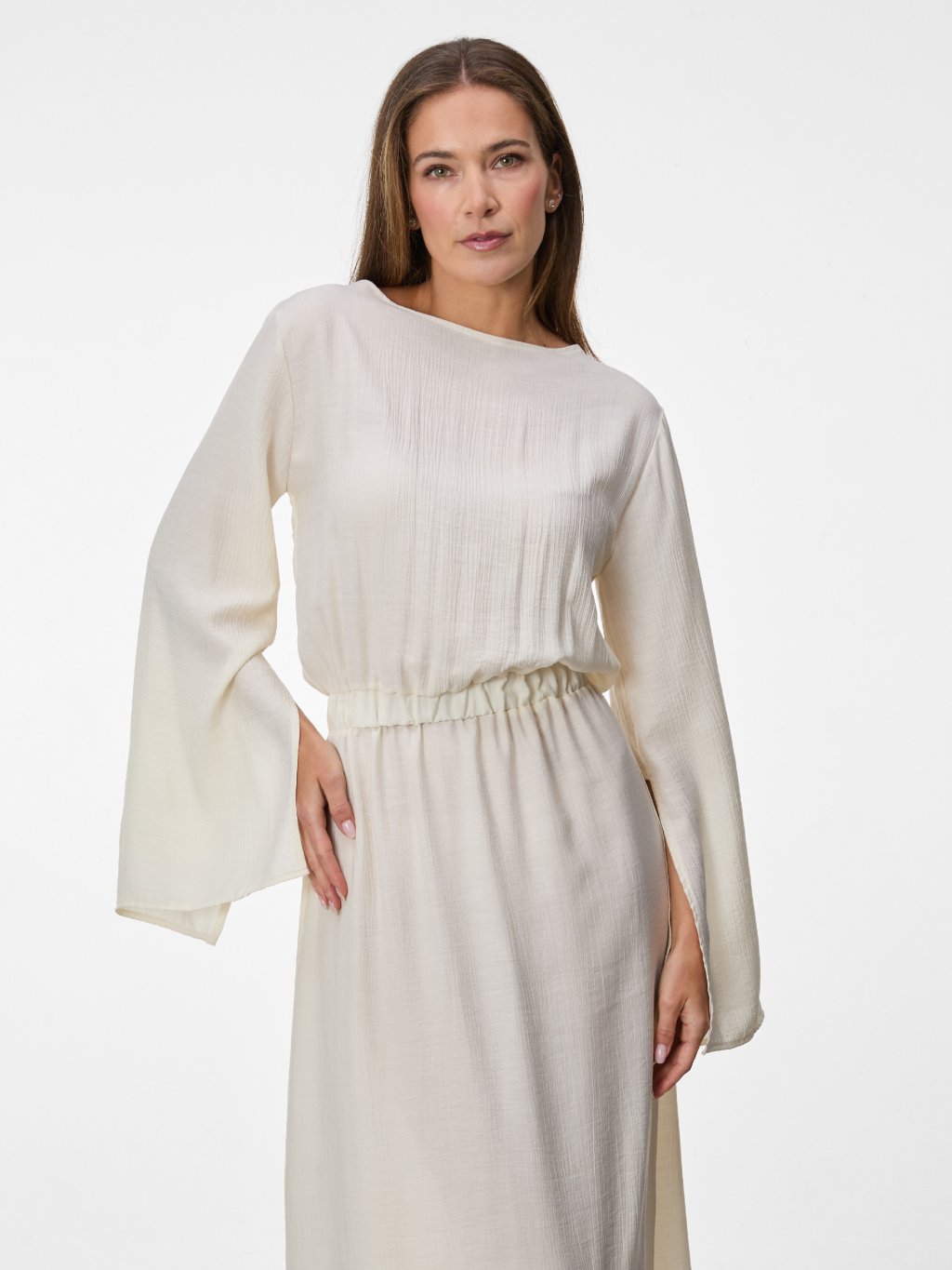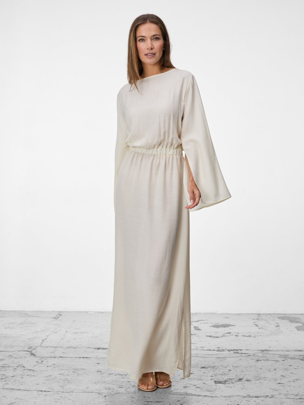Dlouhé rukávy s rozparky dodávají modelu lehkost a elegantní detail, který podtrhuje nenucený charakter šatů. Model je součástí kolekce Sands.