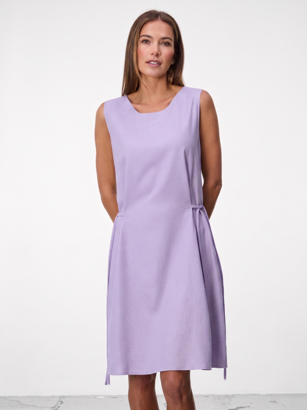 Čistá silueta šatů Calma bez rukávů působí elegantně a minimalisticky, zatímco jemné sklady a vázání v pase dodávají modelu lehkost a ženský tvar.