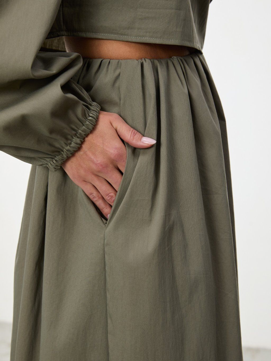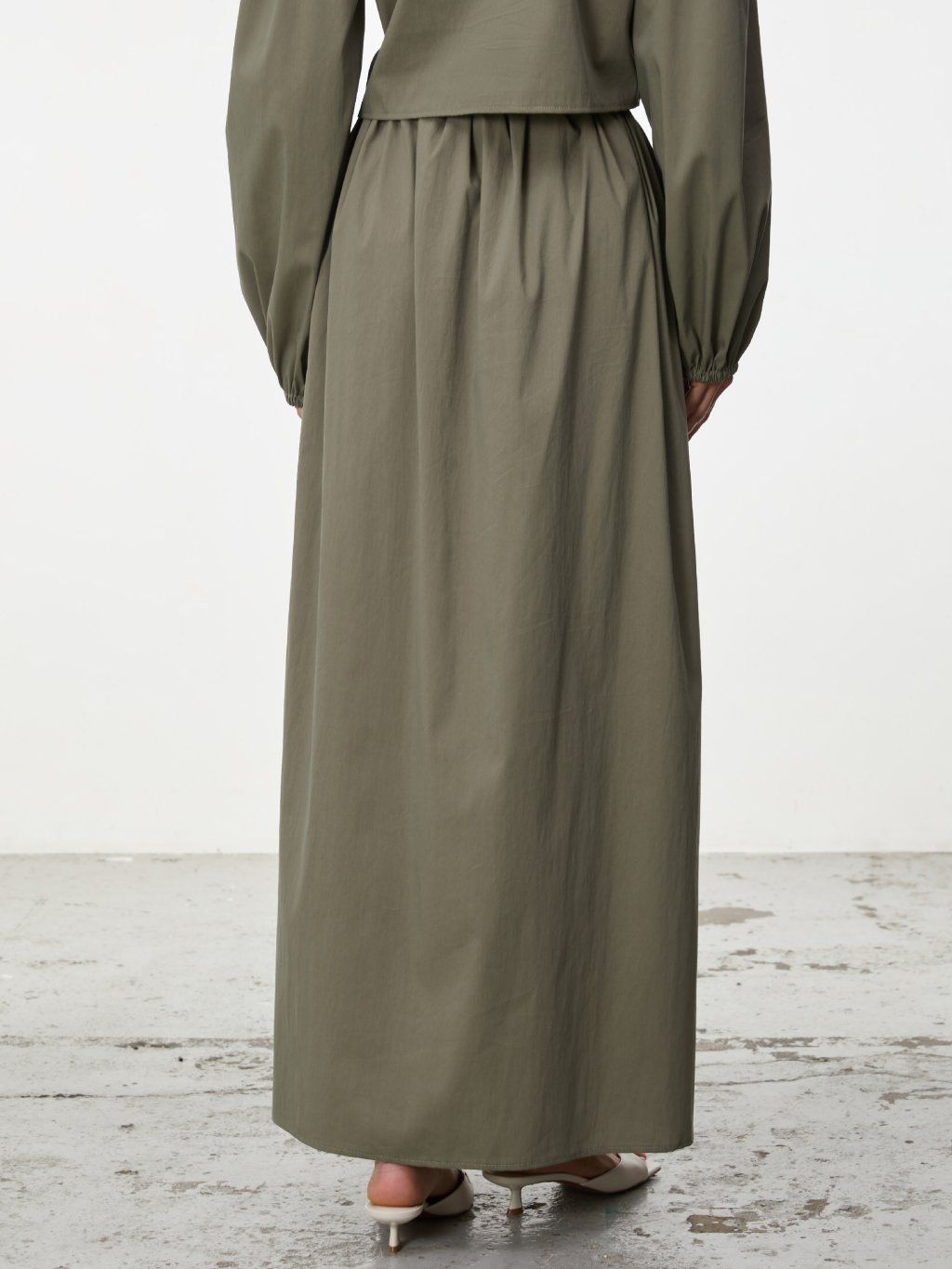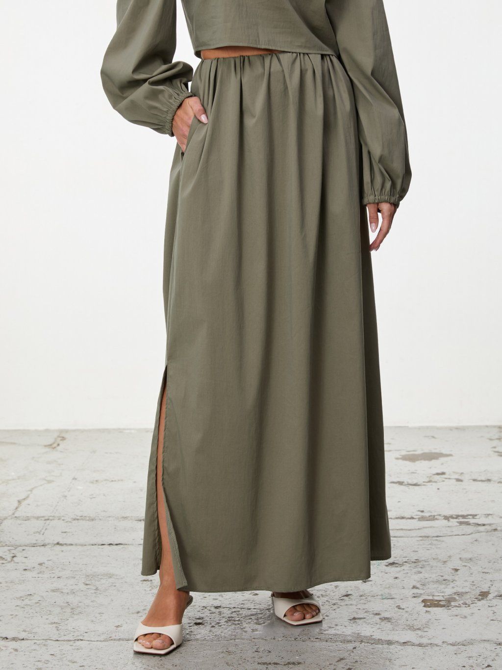 Dlouhá bavlněná sukně v khaki barvě přináší pocit svobody a lehkosti v každém kroku. Vysoký pas s pohodlnou gumou krásně sedí a zároveň zajišťuje maximální komfort při nošení.