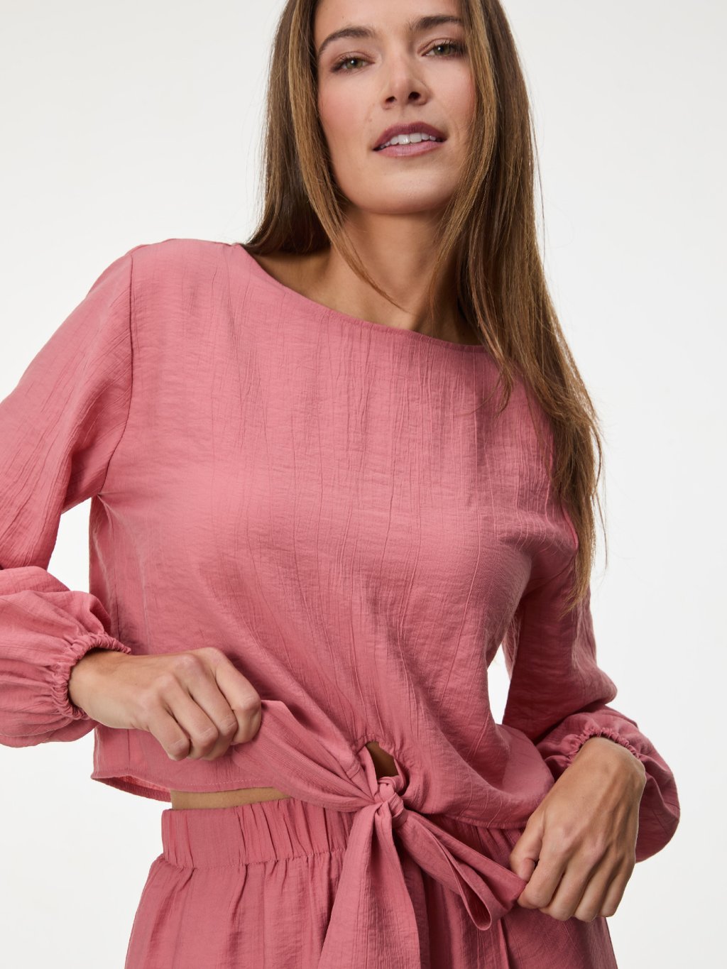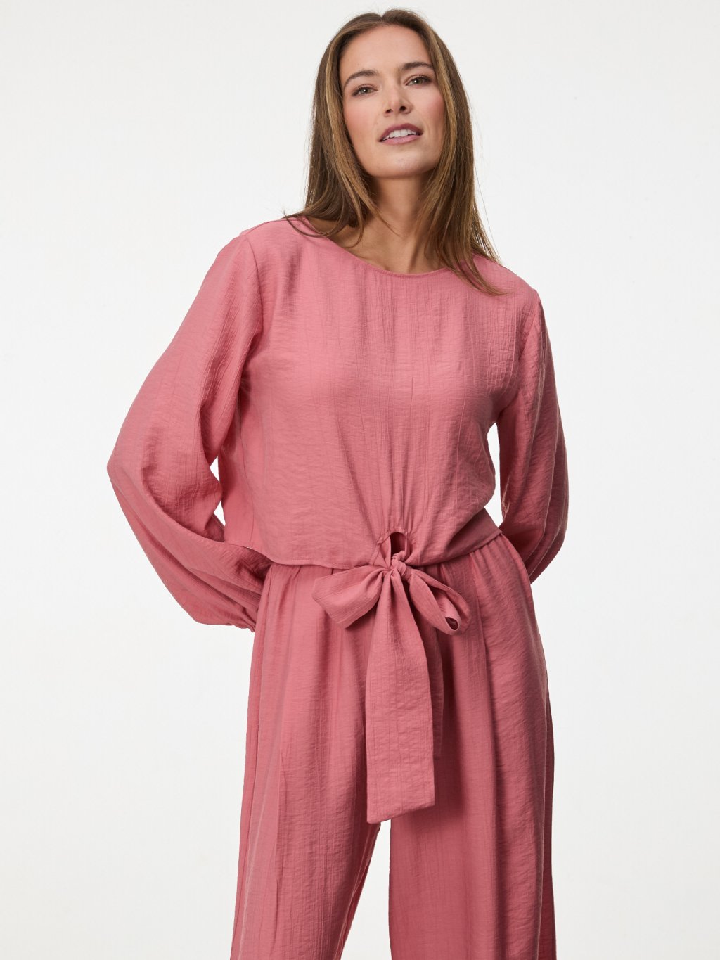 Dlouhá mašle umožňuje přizpůsobit siluetu podle potřeby a dodává modelu ženskost i nenucenou eleganci.