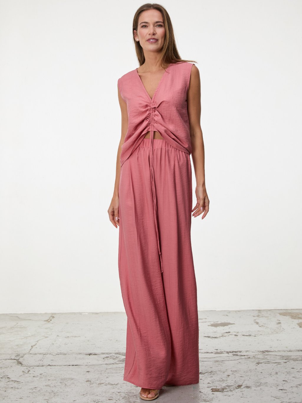 Vzdušný viskózový top s hlubším výstřihem a nastavitelným řasením na předním díle umožňuje přizpůsobit siluetu podle nálady i příležitosti. Měkký a mačkaná viskóza krásně splývá s tělem a zajišťuje maximální komfort během teplých dní.