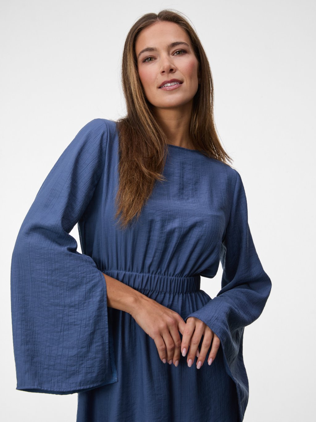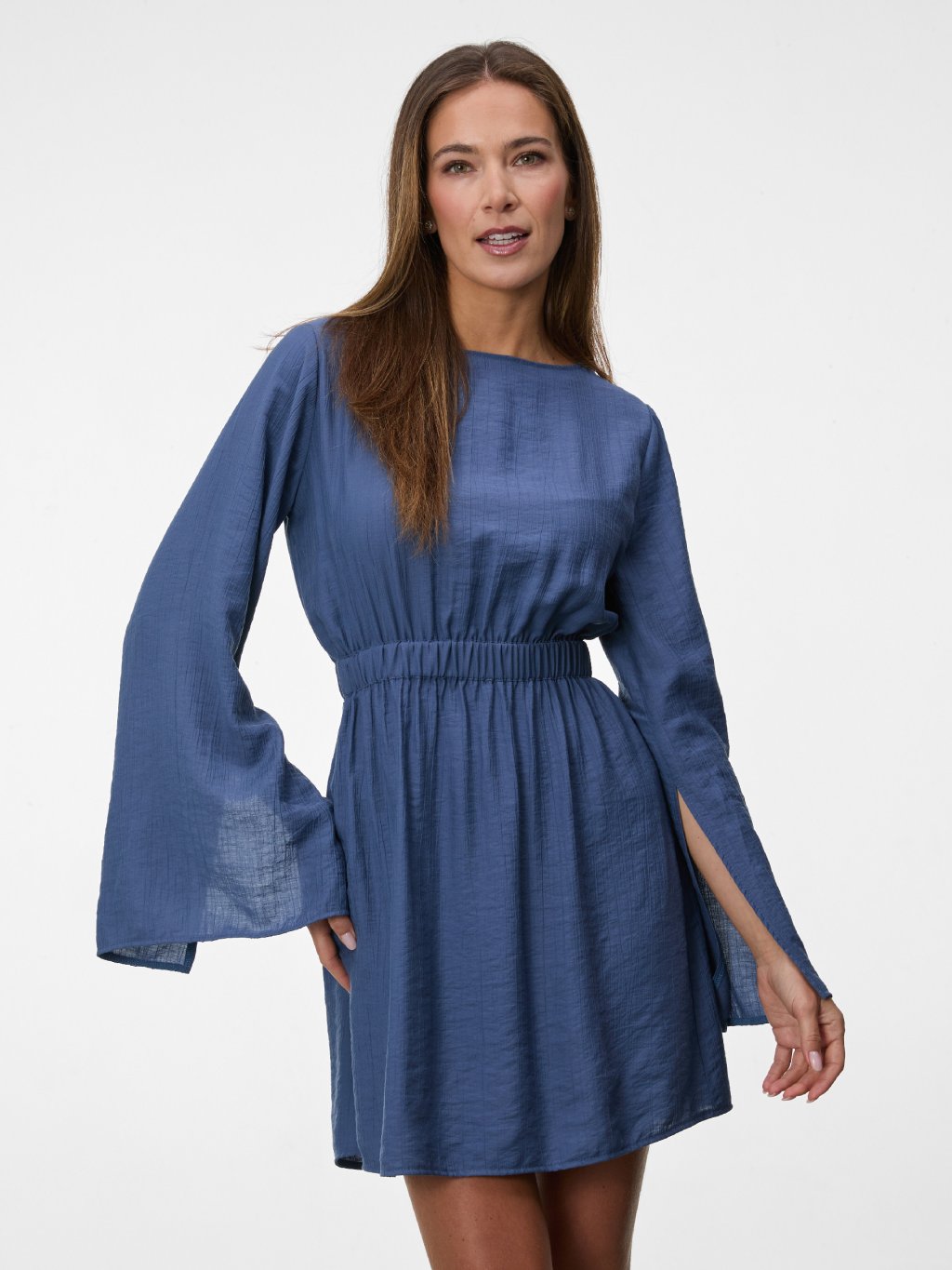 Dlouhé rukávy s rozparky dodávají modelu lehkost a elegantní detail, který podtrhuje nenucený charakter šatů. Model je součástí kolekce Sands.