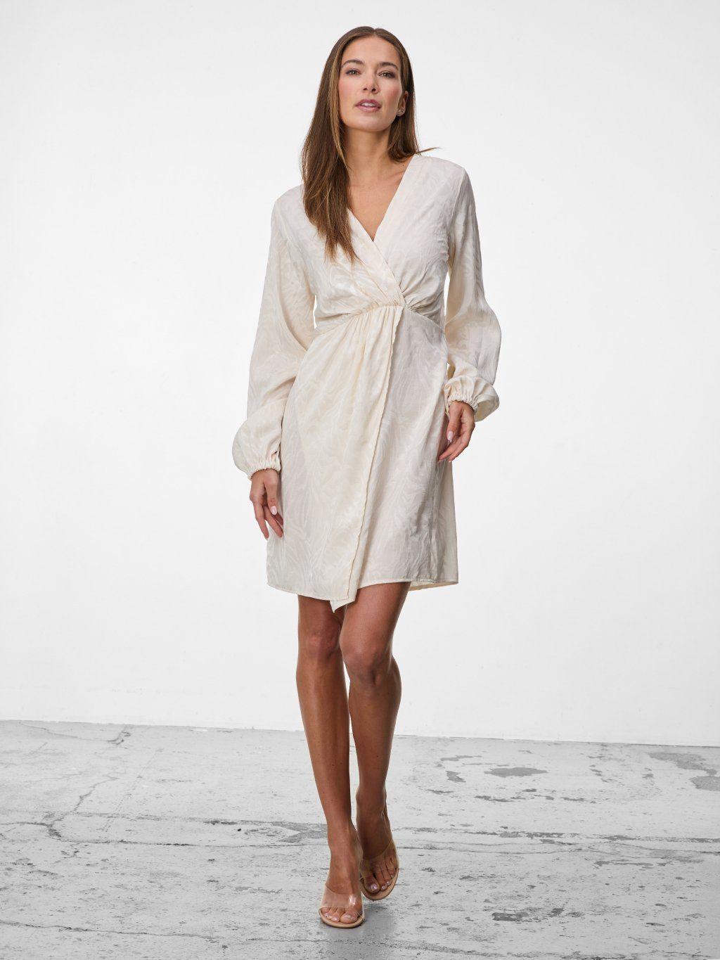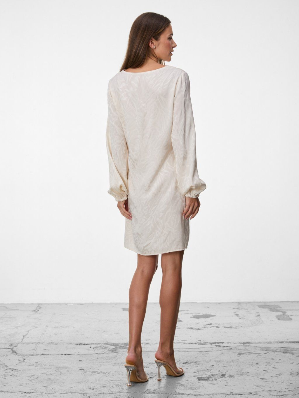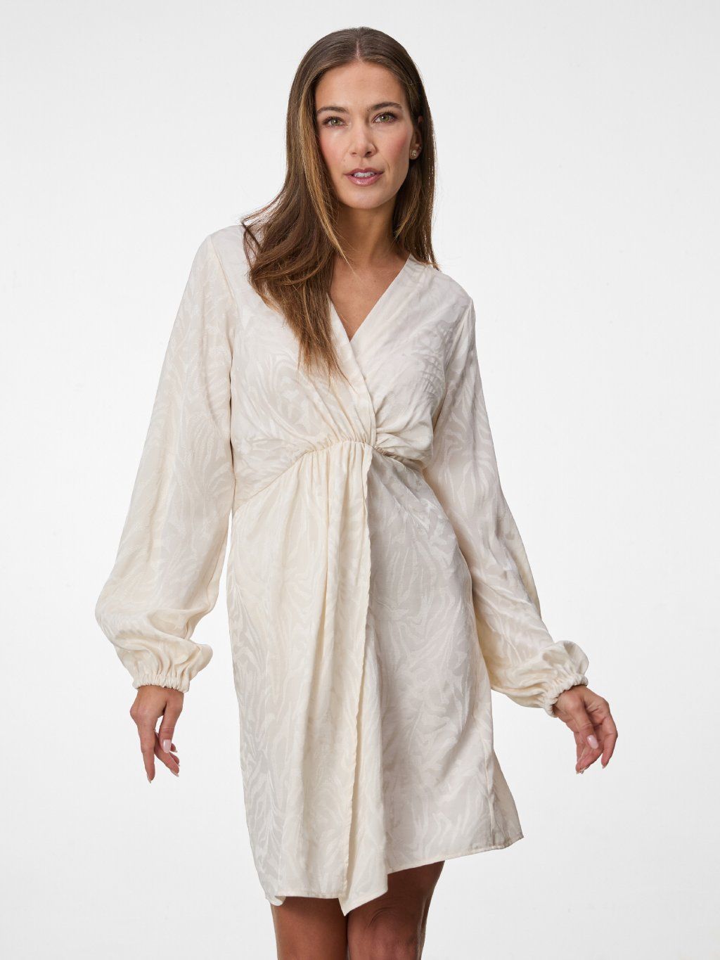 Jemně strukturovaný materiál s decentním vzorem dodává šatům luxusní nádech, zatímco volnější rukávy s pružným zakončením podtrhují jejich vzdušnost a ženskost.