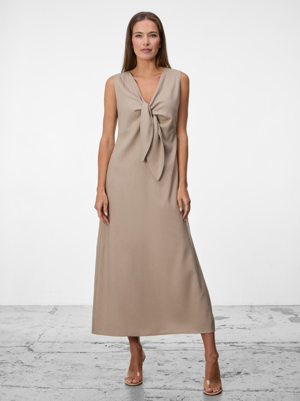 Vzdušný lněný model v tmavé béžové barvě s elegantní délkou a jemným zavazováním vytváří ženskou siluetu bez zbytečné okázalosti.