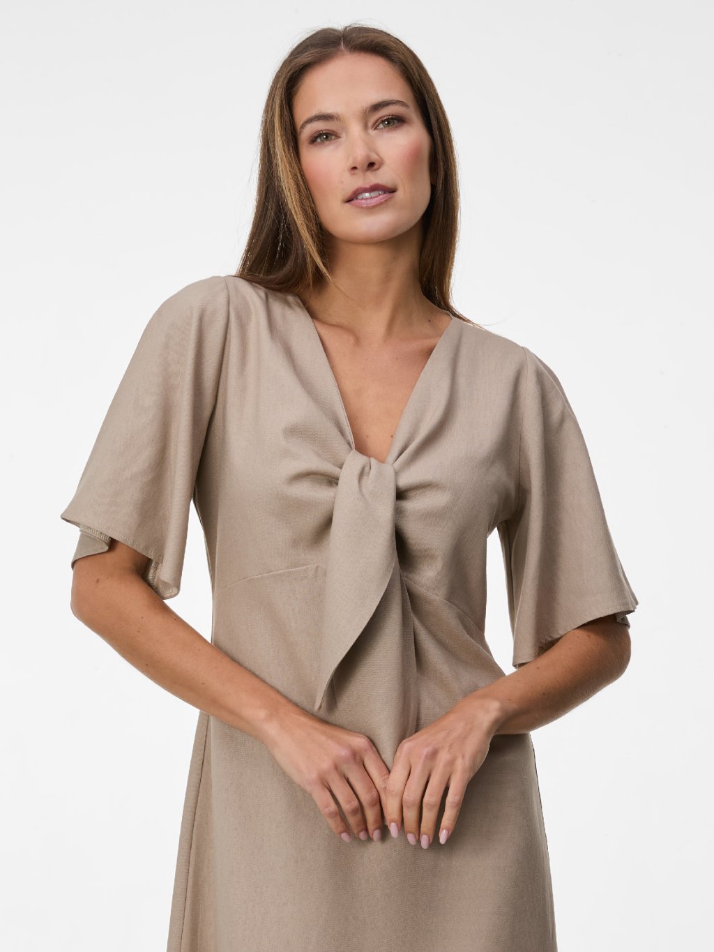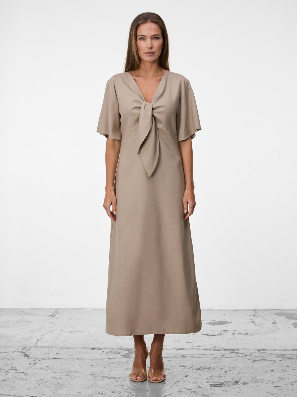 Vzdušný lněný model v tmavé béžové barvě s elegantní délkou a jemným zavazováním vytváří ženskou siluetu bez zbytečné okázalosti.