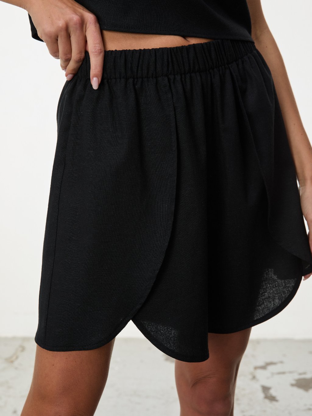 Vzdušné lněné kraťasy s jemnými rozparky po stranách dodávají siluetě volnost a nenucenou eleganci.