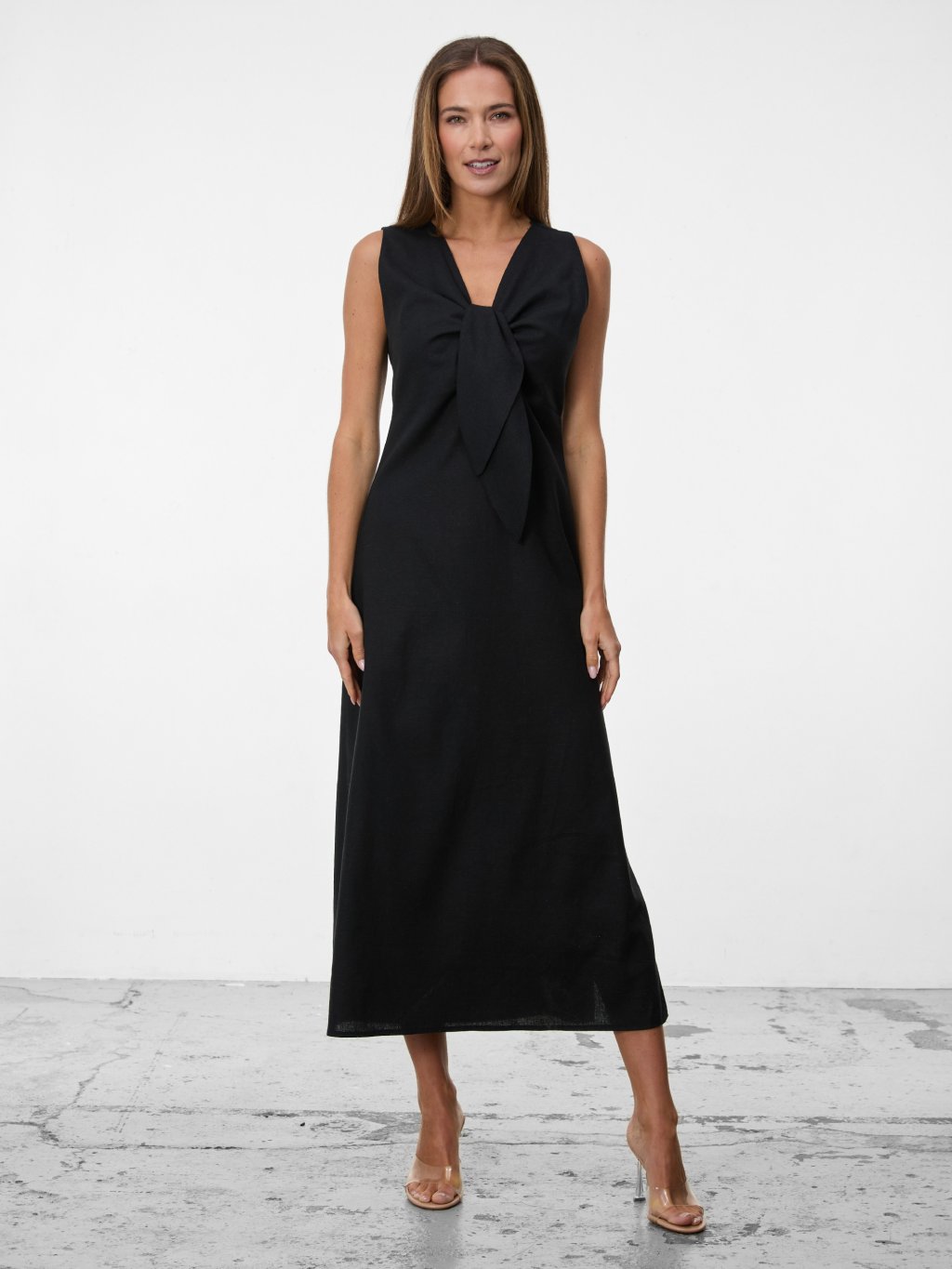 Vzdušný lněný model v černé barvě s elegantní délkou a jemným zavazováním vytváří ženskou siluetu bez zbytečné okázalosti.