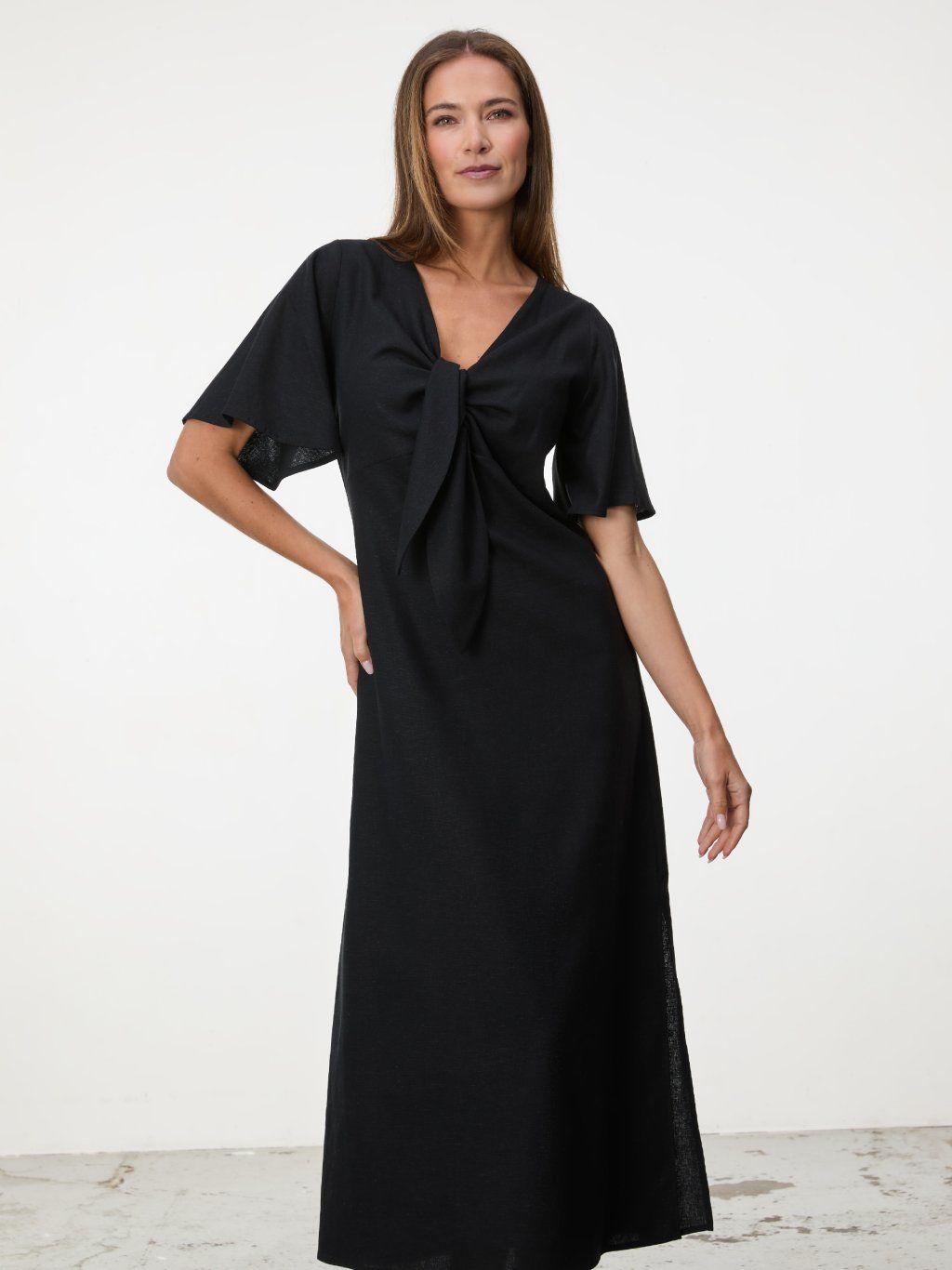 Vzdušný lněný model v černé barvě s elegantní délkou a jemným zavazováním vytváří ženskou siluetu bez zbytečné okázalosti.