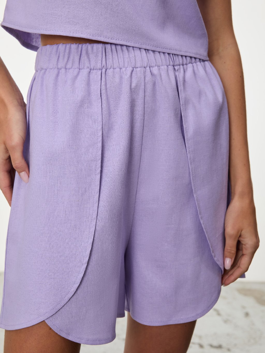 Vzdušné lněné kraťasy s jemnými rozparky po stranách dodávají siluetě volnost a nenucenou eleganci.
