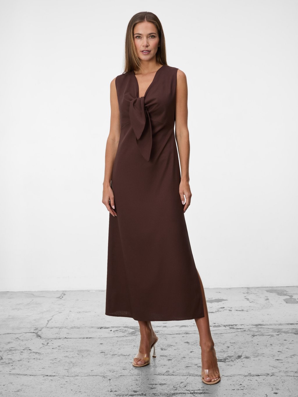 Vzdušný lněný model v teplé hnědé barvě s elegantní délkou a jemným zavazováním vytváří ženskou siluetu bez zbytečné okázalosti.