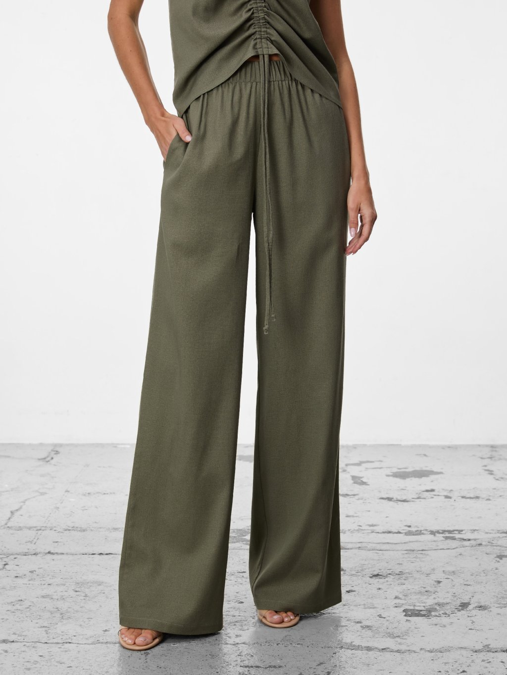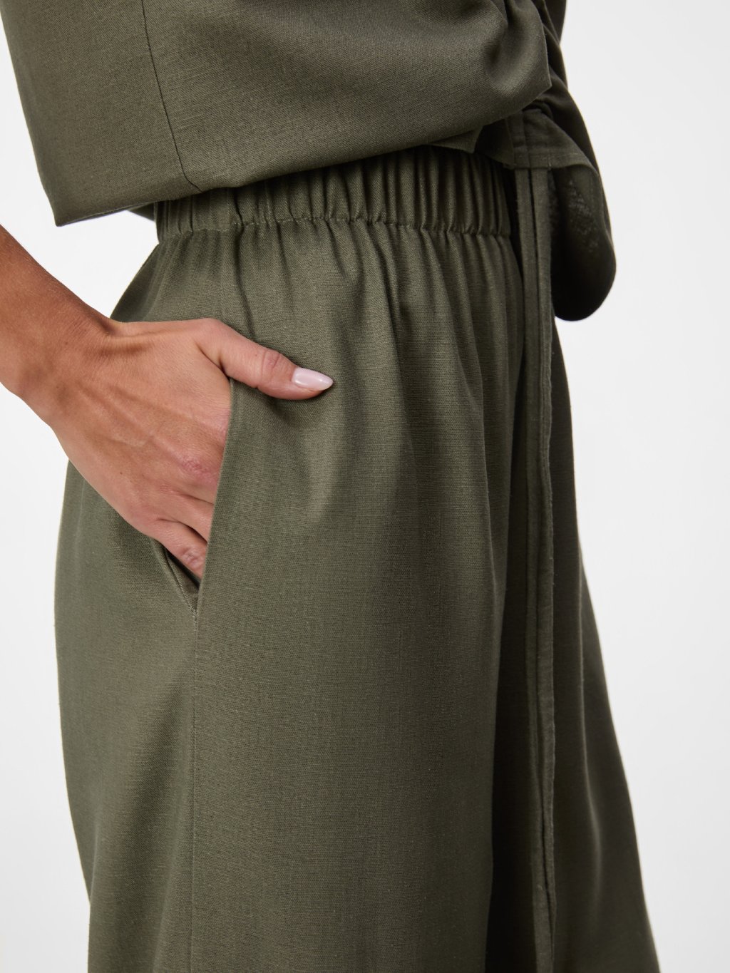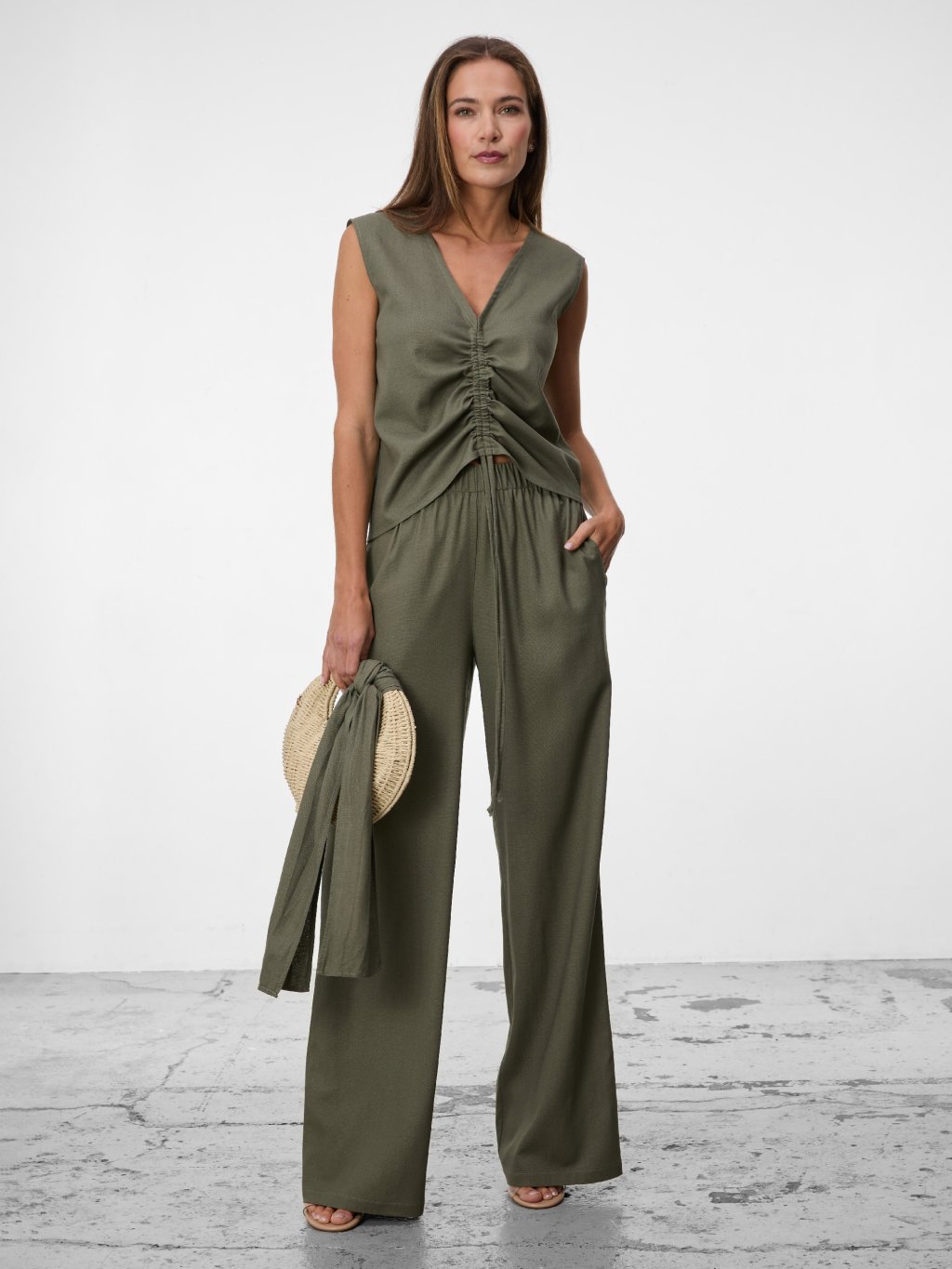 Vzdušné lněné kalhoty s lehce rozšířenou siluetou a praktickými kapsami spojují komfort a nadčasový vzhled. Lehký materiál příjemně splývá s pohybem a zajišťuje pohodlí i během teplejších dnů, aniž by ztrácel na eleganci.