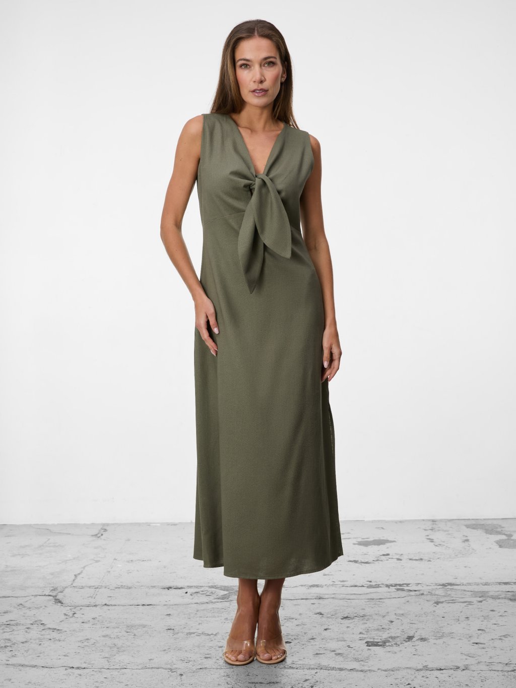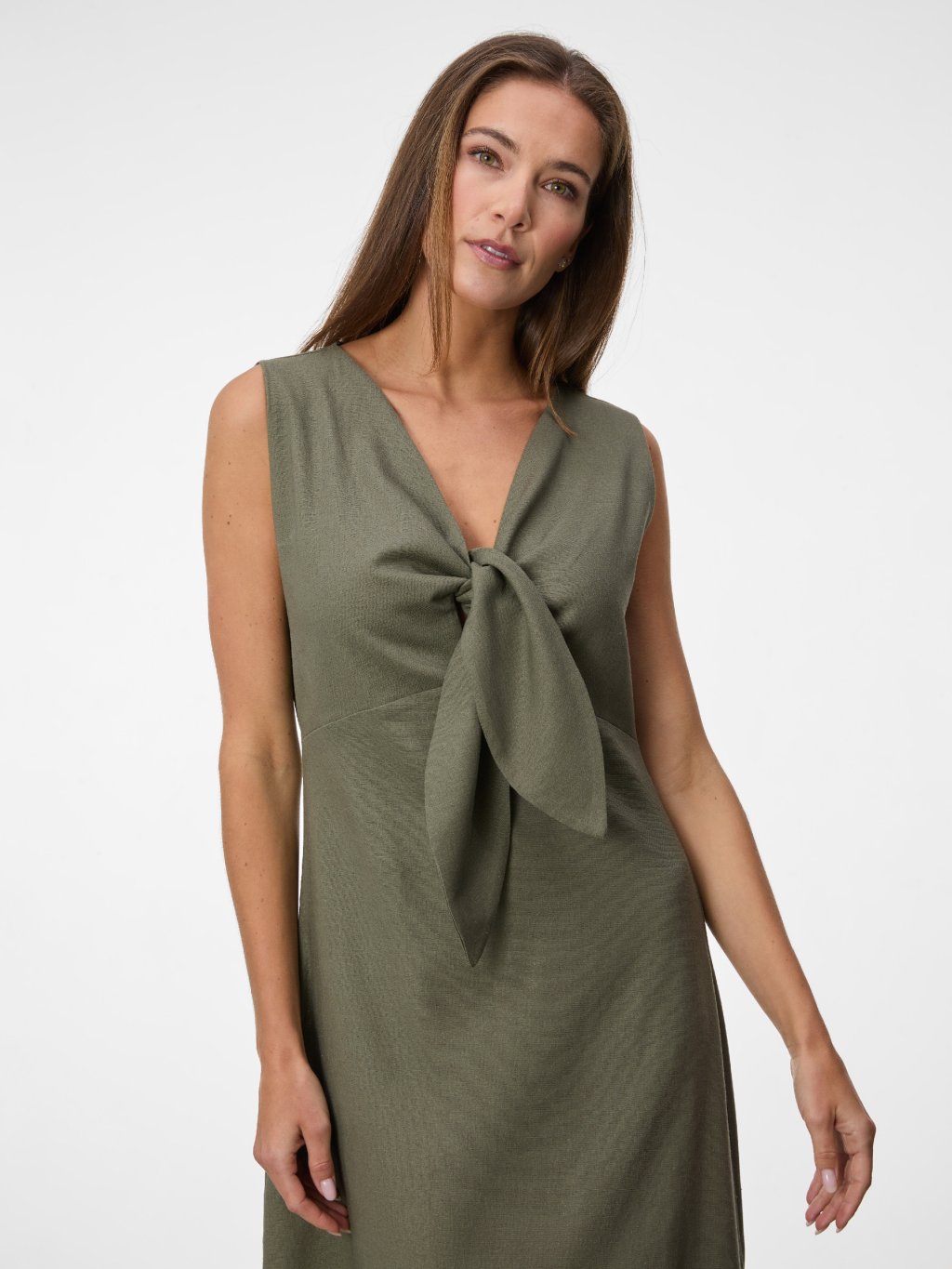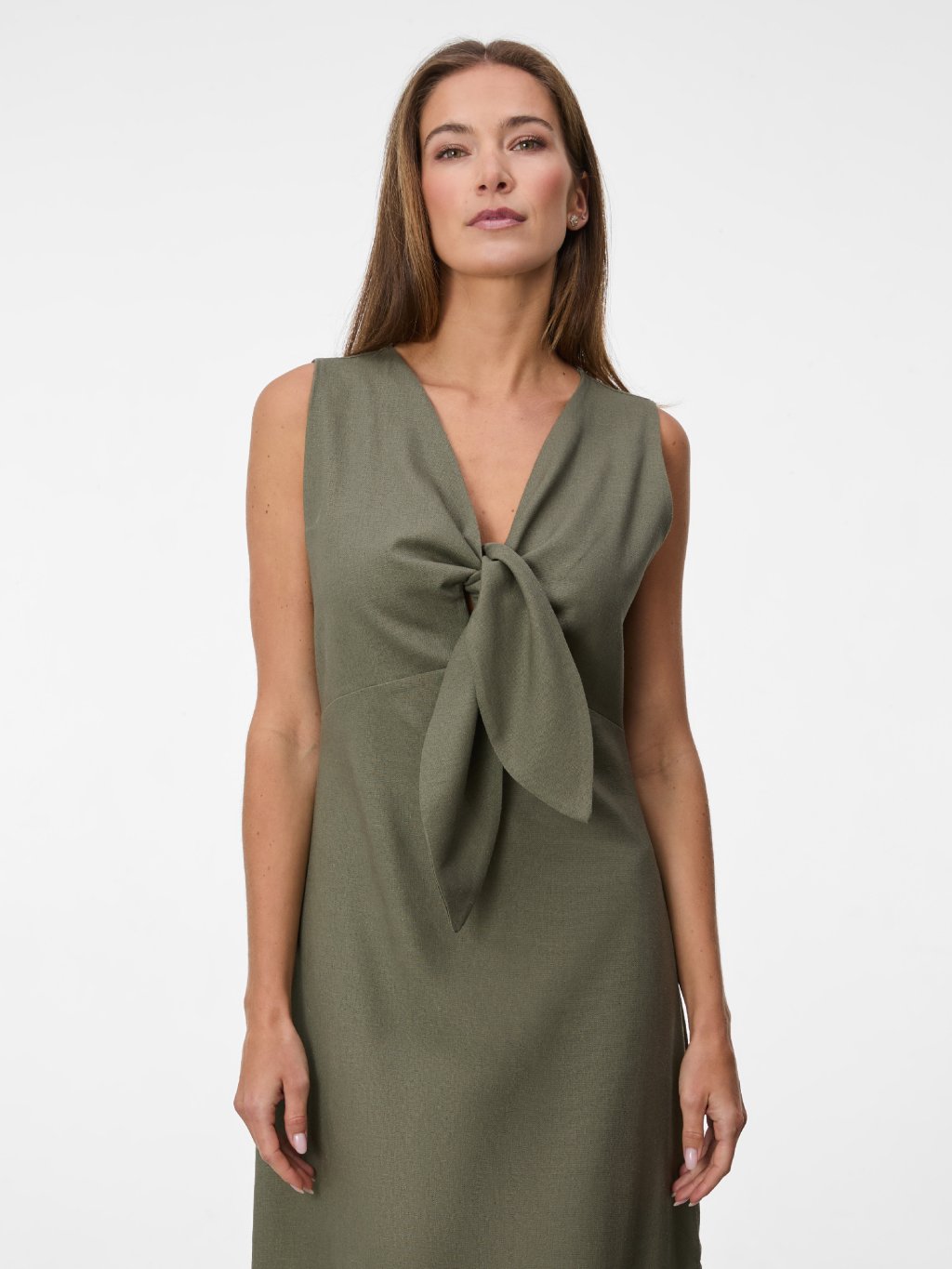 Vzdušný lněný model v khaki barvě s elegantní délkou a jemným zavazováním vytváří ženskou siluetu bez zbytečné okázalosti.