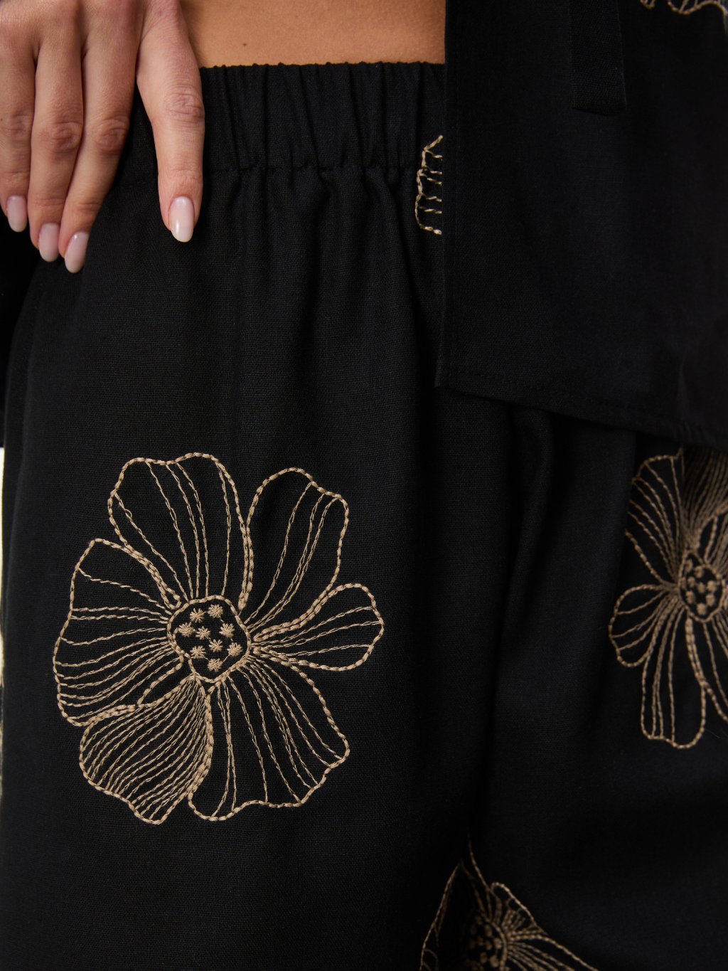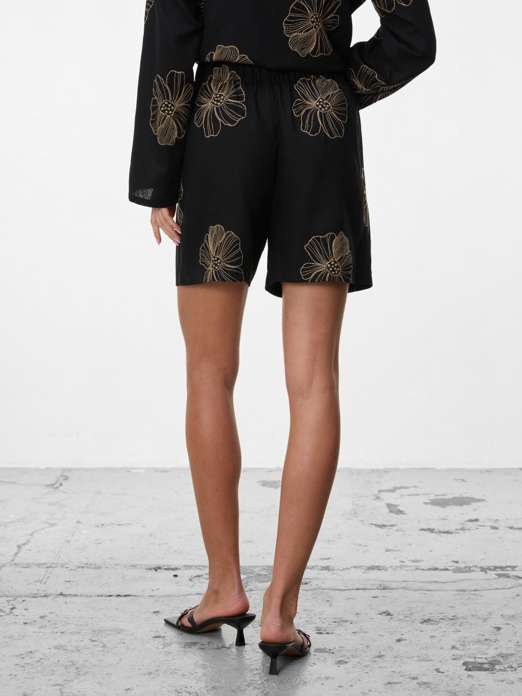 Lehké kraťasy s výrazným květinovým motivem v jemném zlatém tónu dodávají outfitu sofistikovaný, ale stále uvolněný charakter. Černý podklad vytváří elegantní kontrast a nechává vzor krásně vyniknout.