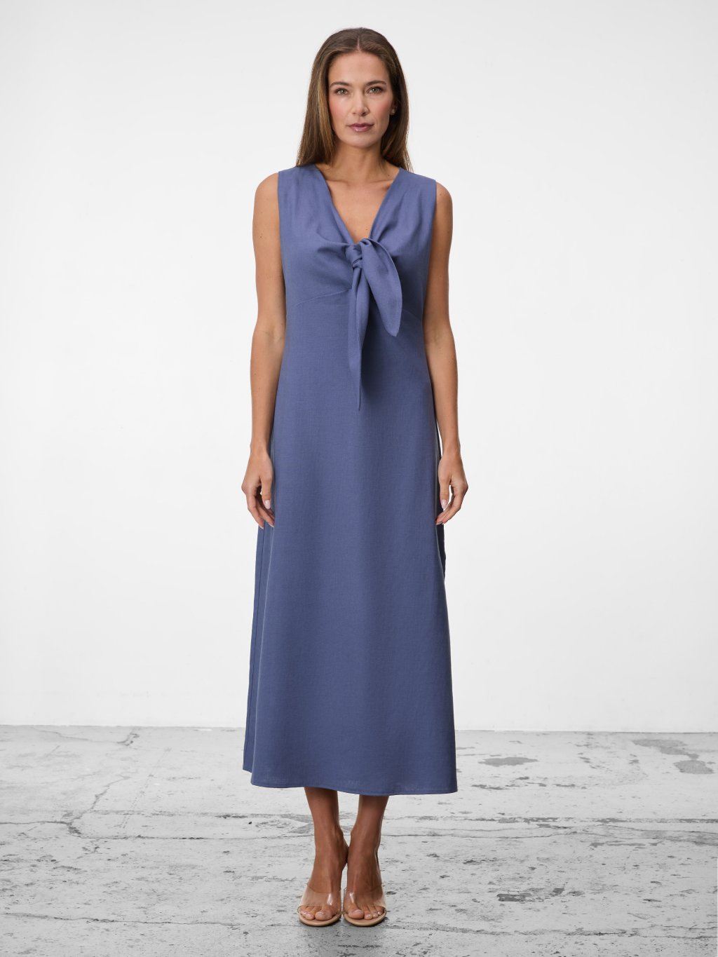 Vzdušný lněný model v denimově modré barvě s elegantní délkou a jemným zavazováním vytváří ženskou siluetu bez zbytečné okázalosti.