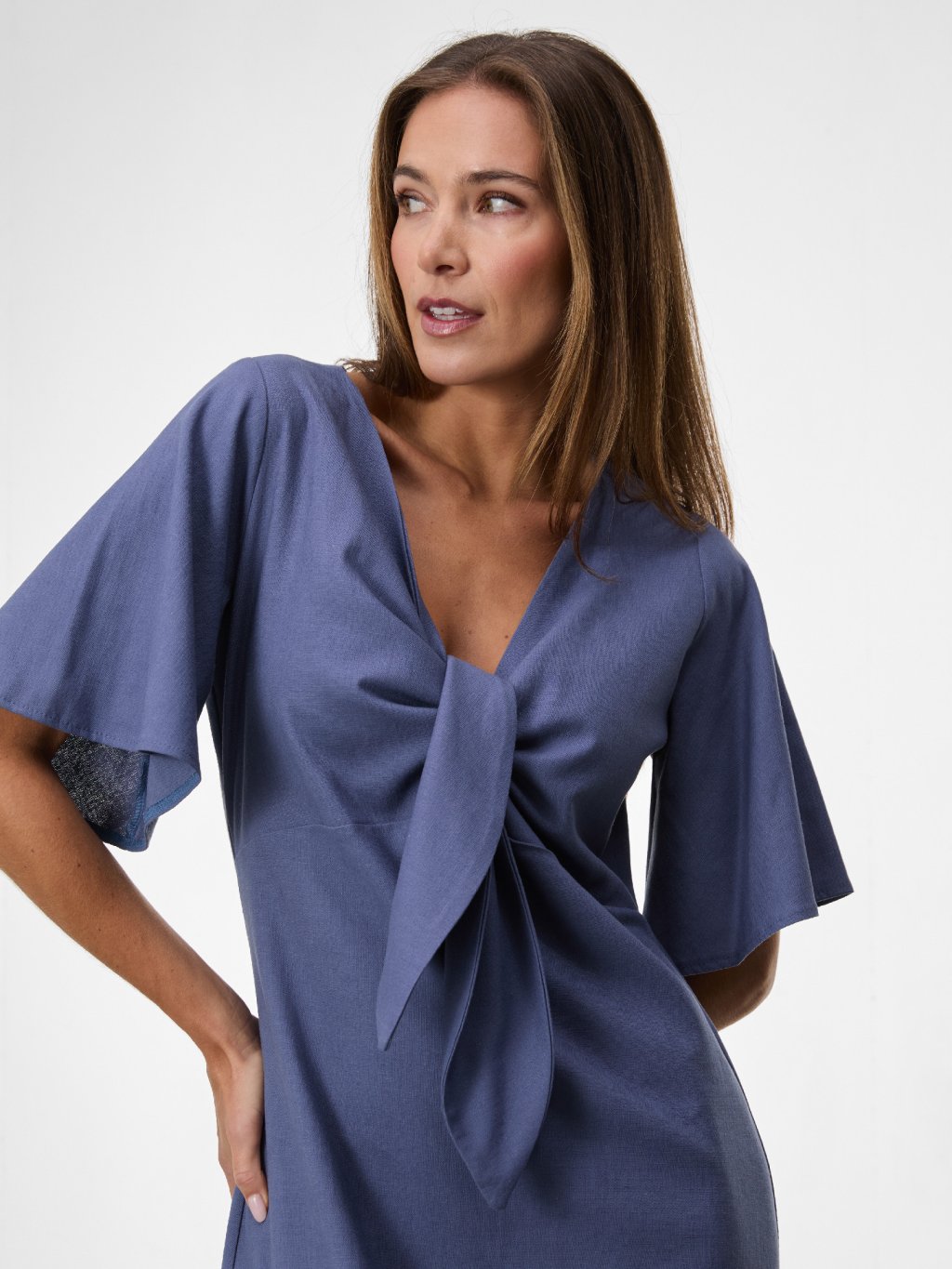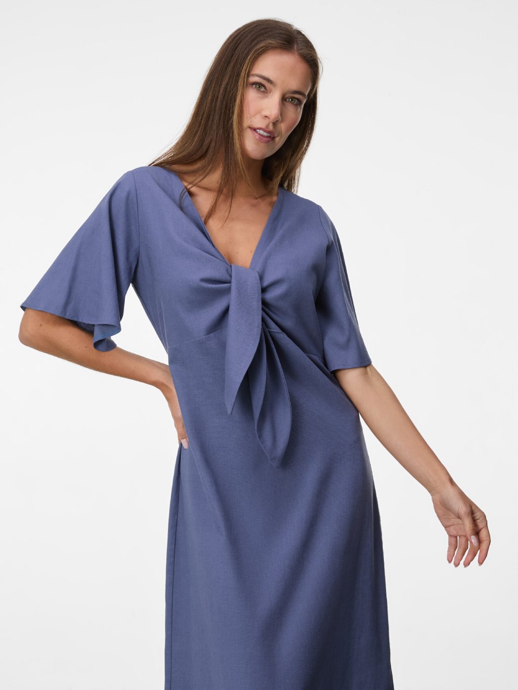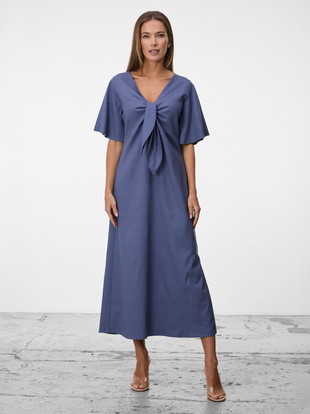 Vzdušný lněný model v denimově modré barvě s elegantní délkou a jemným zavazováním vytváří ženskou siluetu bez zbytečné okázalosti.
