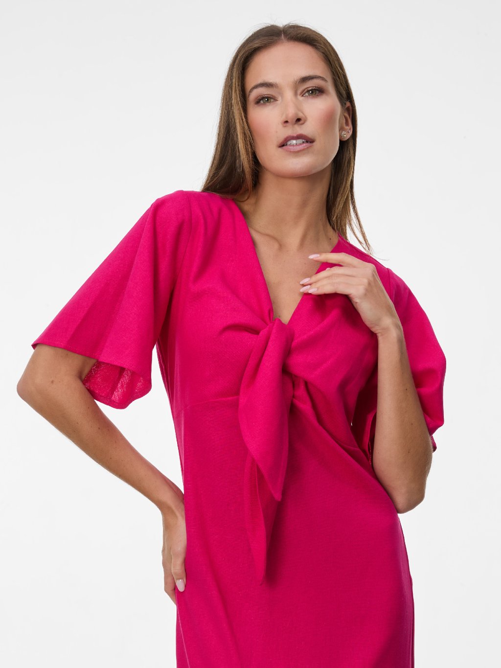 Vzdušný lněný model v zářivě růžové barvě s elegantní délkou a jemným zavazováním vytváří ženskou siluetu bez zbytečné okázalosti.