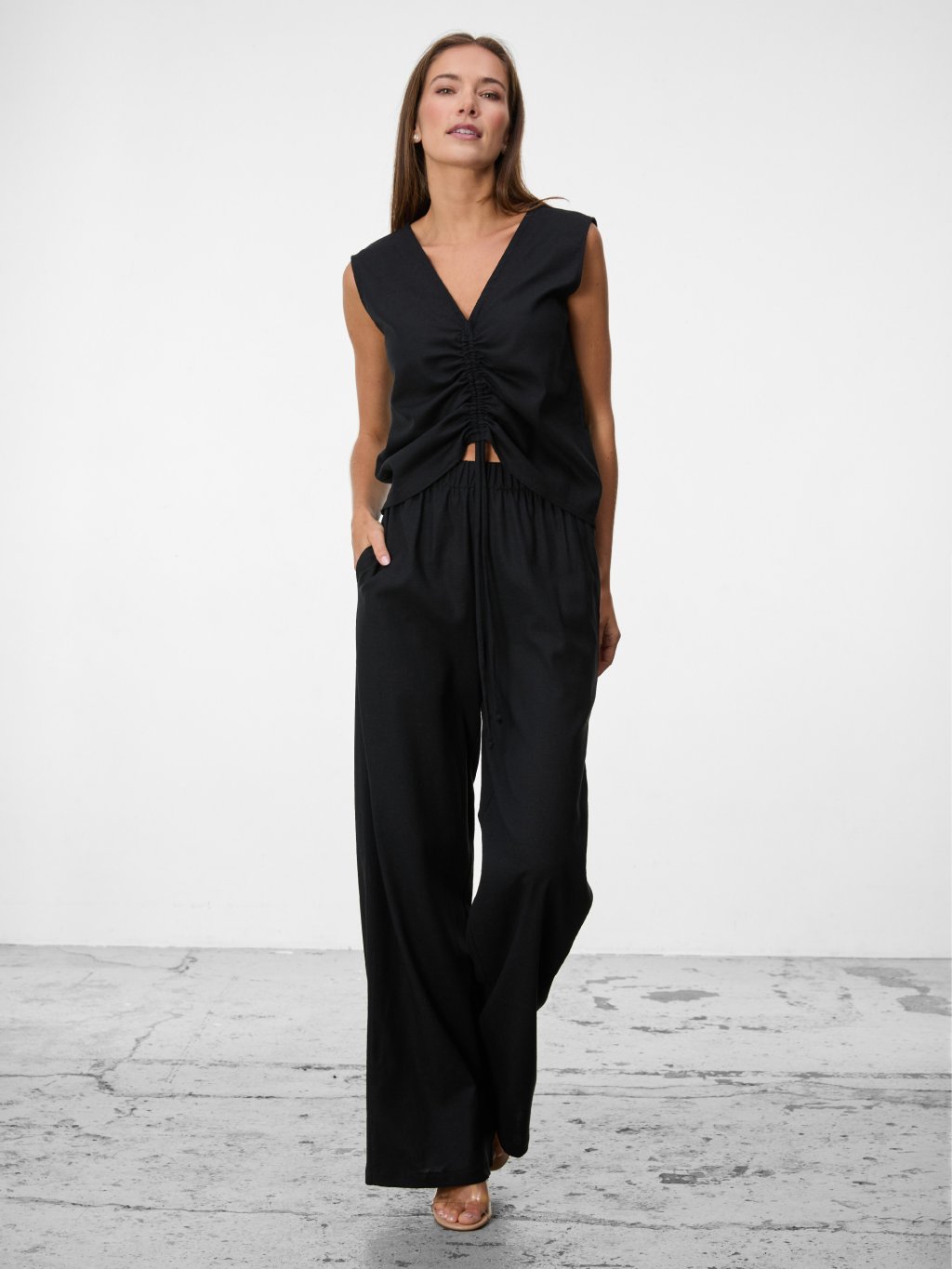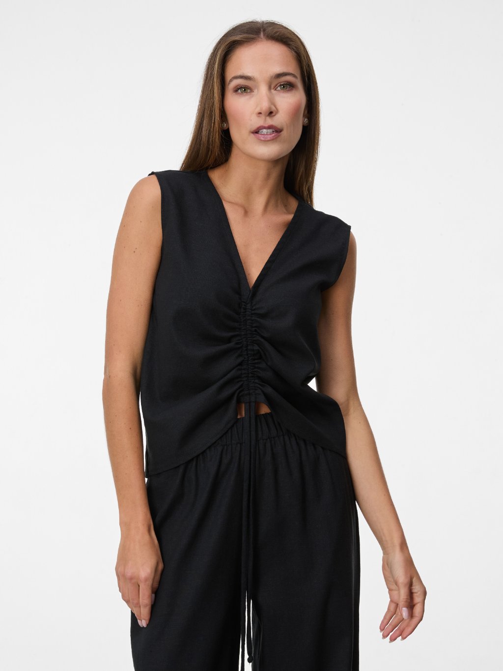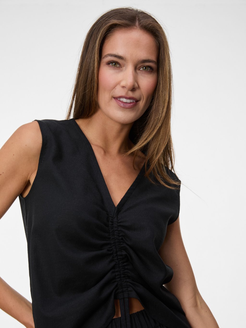 Vzdušný lněný top s hlubším výstřihem a nastavitelným řasením na předním díle.