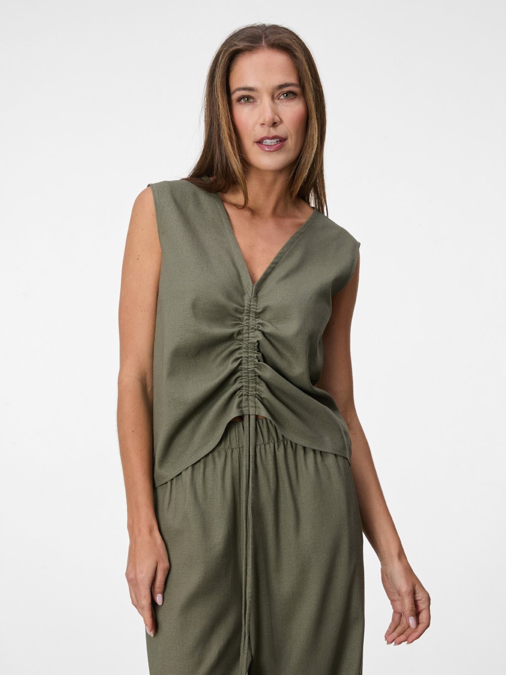 Vzdušný lněný top s hlubším výstřihem a nastavitelným řasením na předním díle.