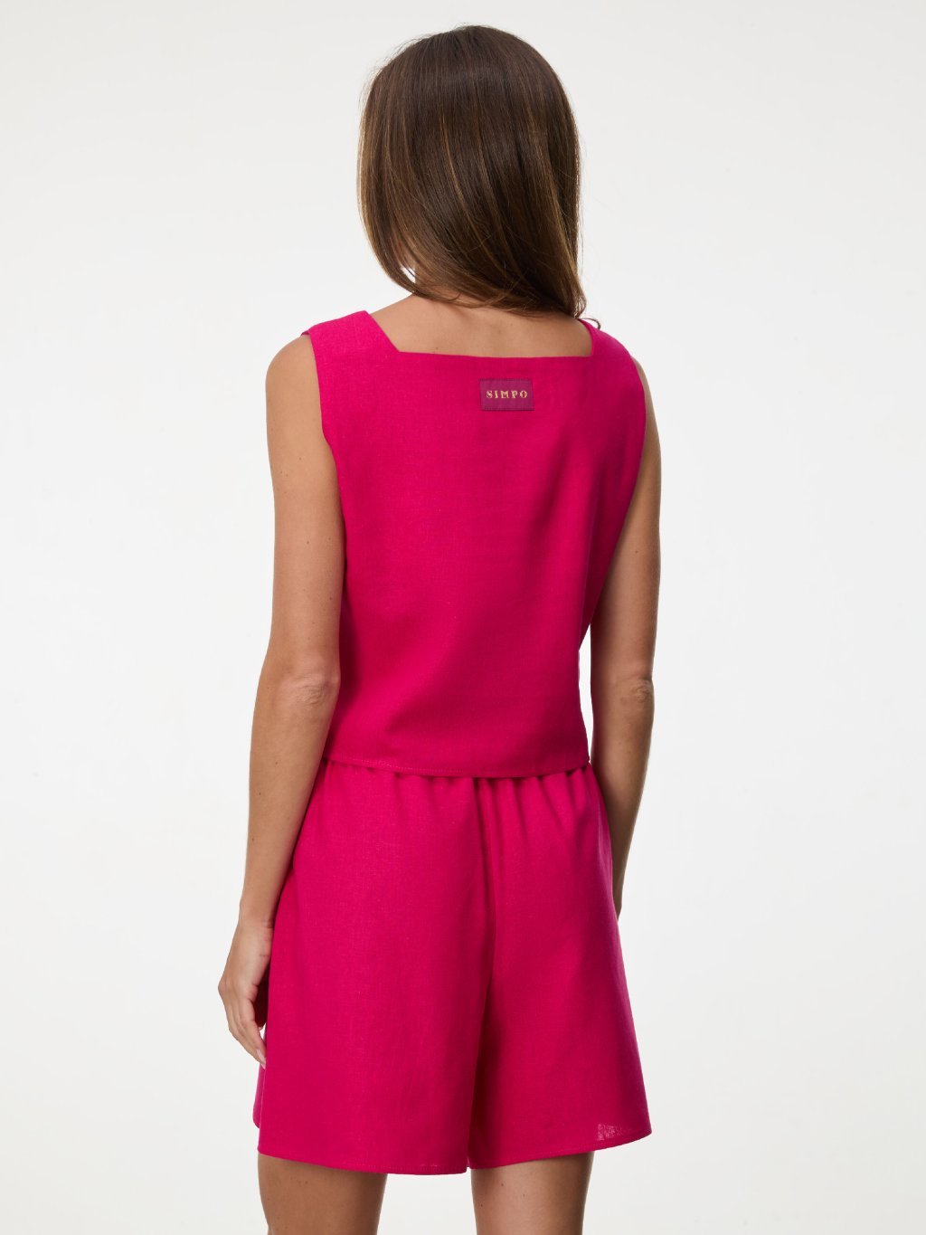 Minimalistický lněný top s rovným výstřihem zaujme svou čistou siluetou a nadčasovým charakterem. Jednoduchý střih nechává vyniknout kvalitnímu materiálu a jemné barevnosti, díky čemuž se top snadno kombinuje a stává se univerzálním letním kouskem.