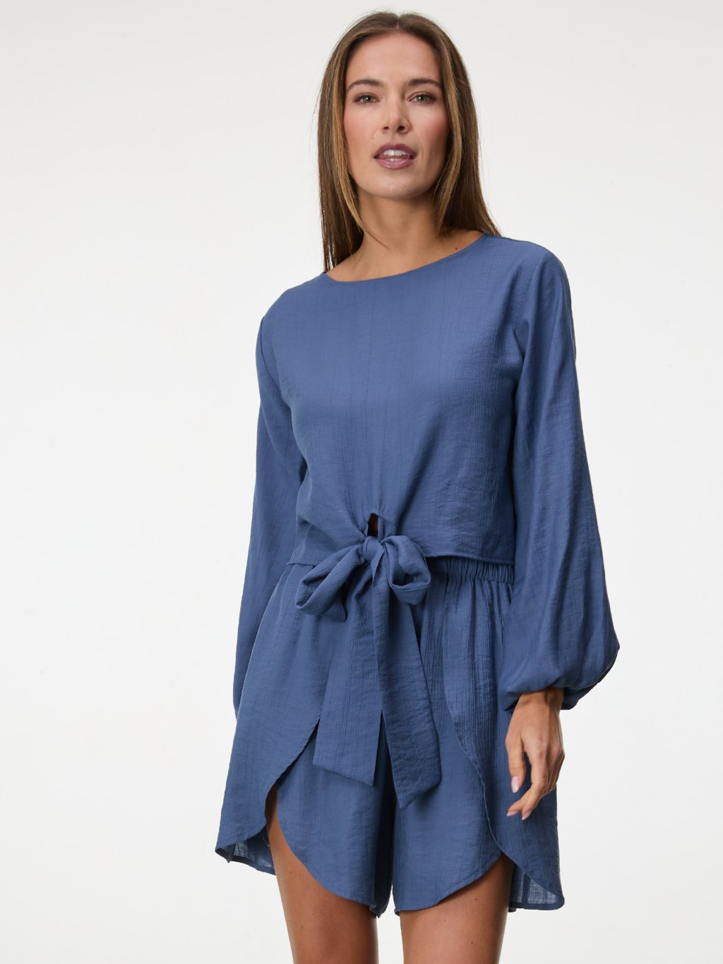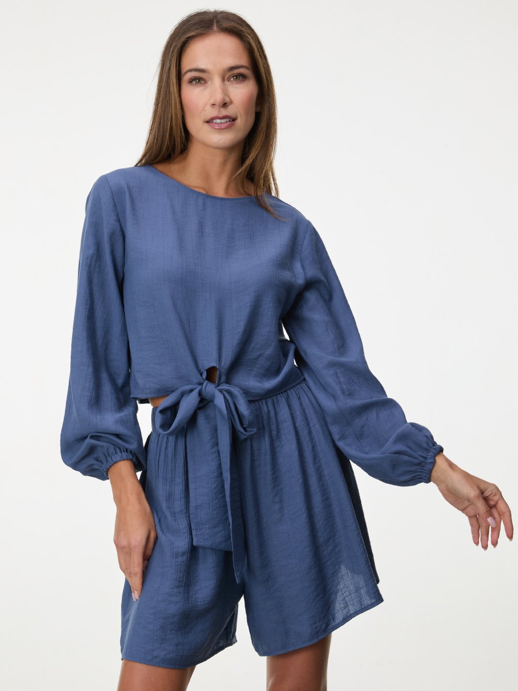 Lehká košile Shell z jemné viskózy s čistým střihem a výrazným detailem v podobě zavazování v pase. Dlouhá mašle umožňuje přizpůsobit siluetu podle potřeby a dodává modelu ženskost i nenucenou eleganci. Rukávy jsou široké a zakončené gumičkou, což je velmi příjemné na nošení a model to krásně oživí.