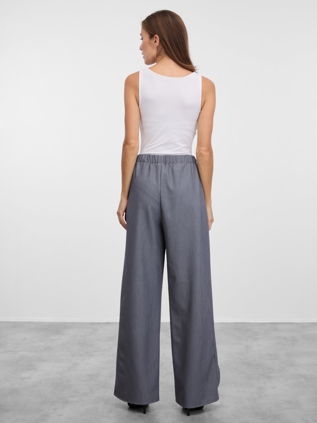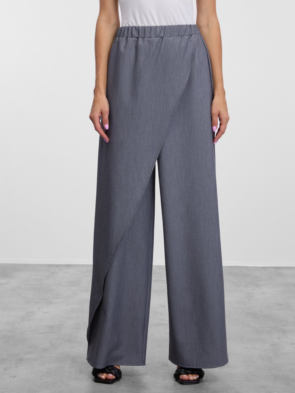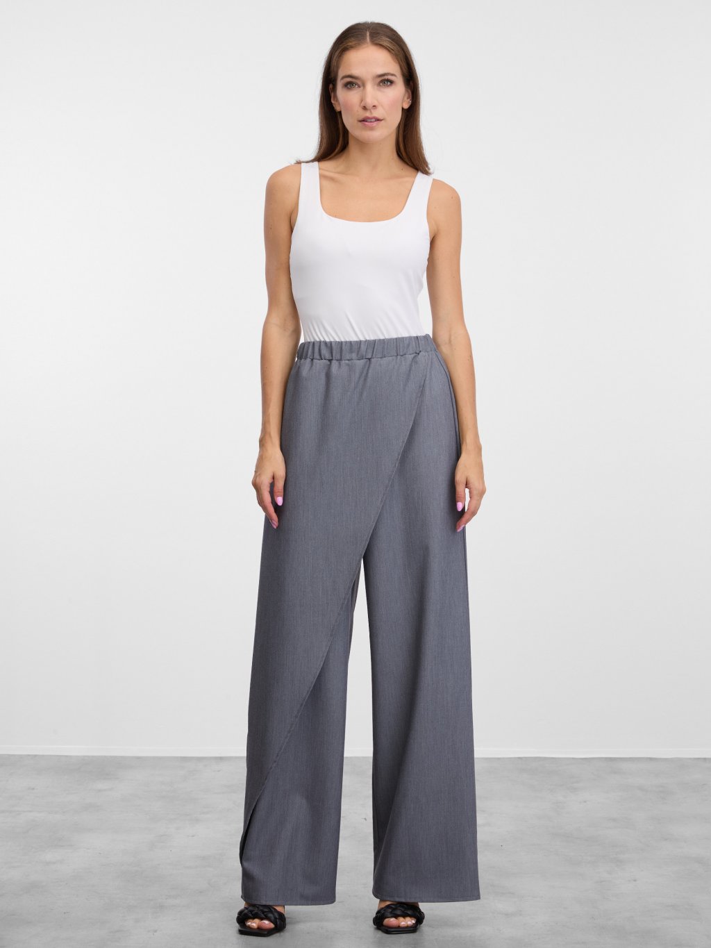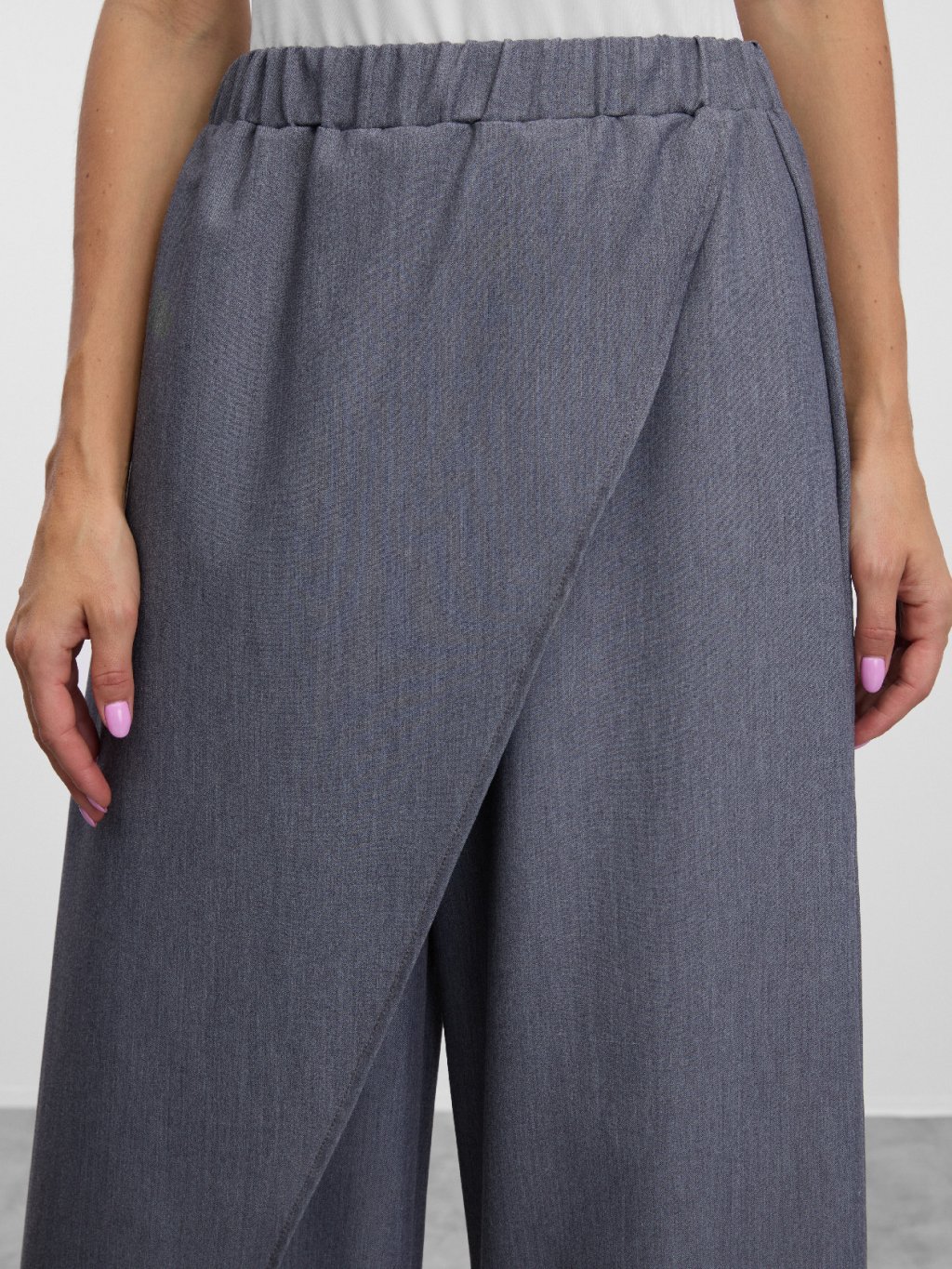 Když kalhoty potkají sukni! Inovativní design, který vynikne při každém pohybu. Asymetrická sukně vpředu dodává modelu jedinečný vzhled, který jen tak někdo nepřehlédne. Perfektní volba pro ty, kdo se nebojí vystoupit z davu! Kalhoty mají široké nohavice. Po celém obvodu v pase je guma pro vaše maximální pohodlí. Na přání vám upravíme délku kalhot - zkrátíme či prodloužíme.