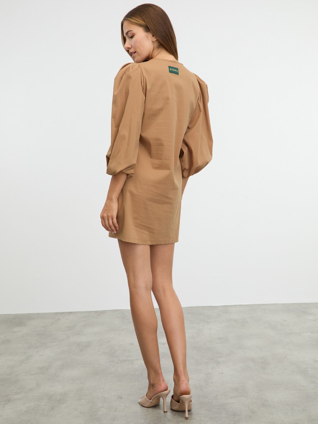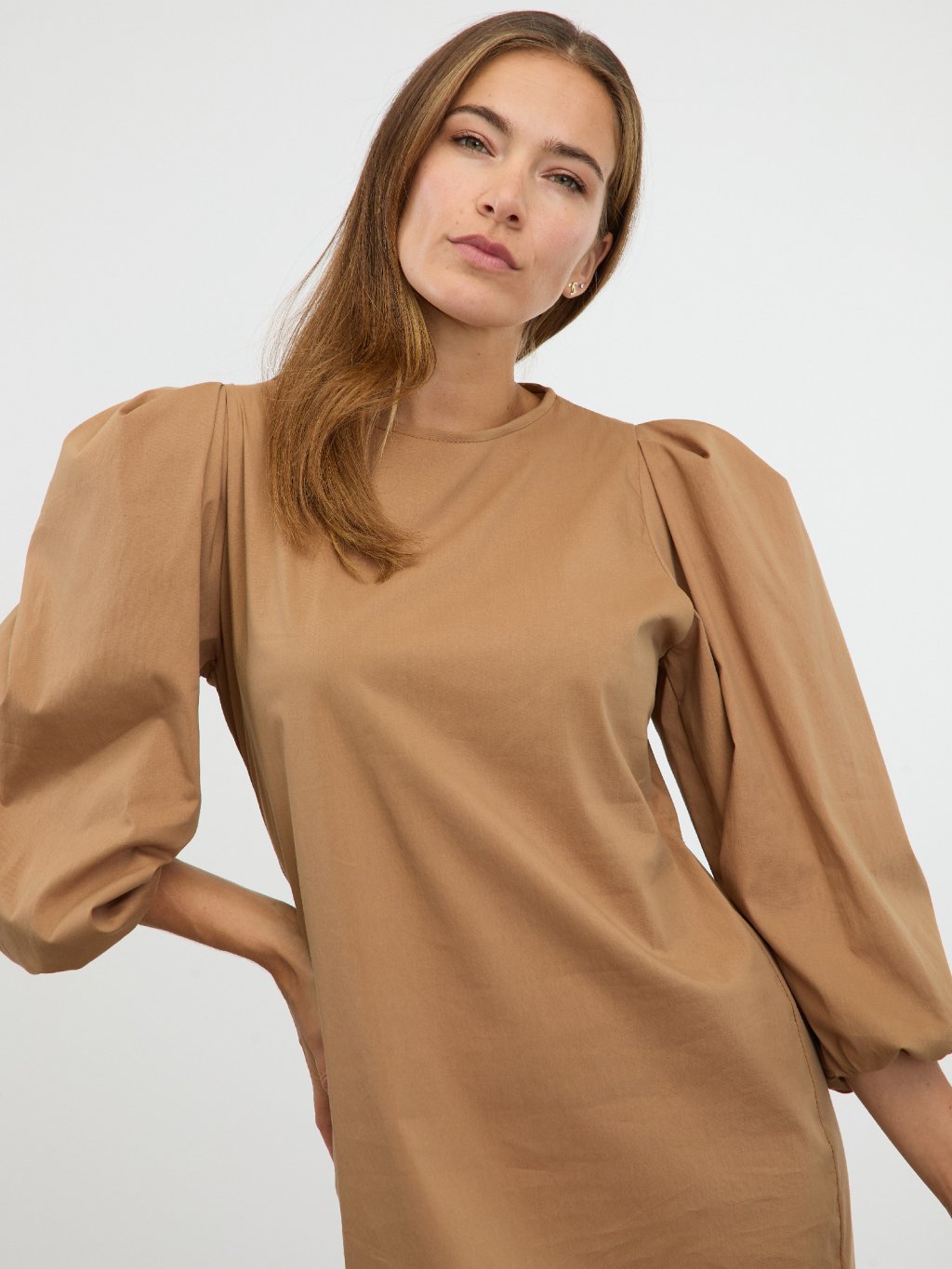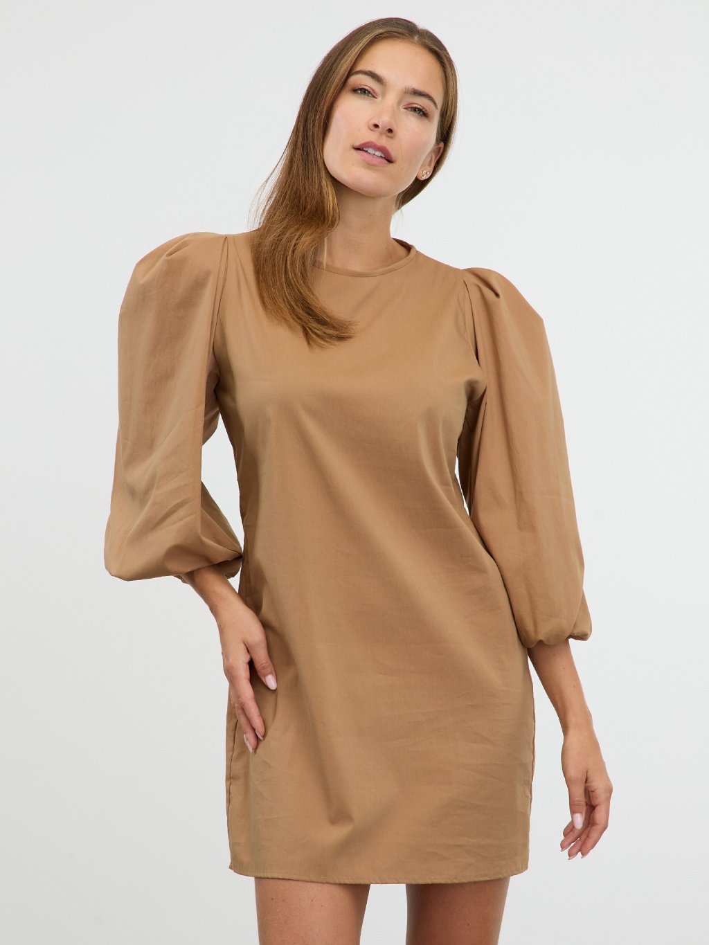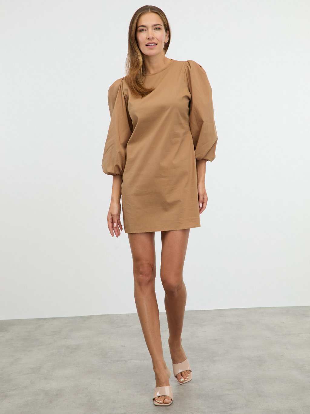 Bavlněné camel šaty SIMPO s balónovými rukávy.