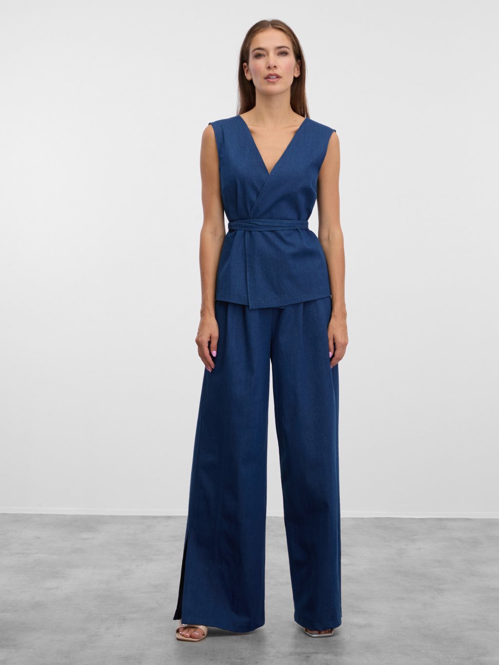 Trendy vestička ve spojení s denime, to je láska na první pohled. V provedení naší jemné džínoviny a zavinovacího střihu se můžete spolehnout, že se stane vaším oblíbeným kouskem. Vestu zavinete, pásek provléknete otvorem v bočním švu a utáhnete na tkaničku jak je potřeba. Tím si i regulujete hloubku výstřihu. Pod vestu se vejde klidně tílko nebo i slabší rolák v zimě. Kombinujte s kalhotami Denim Chick nebo s jednobarevnými kalhotami Braccas. Denim se totiž hodí ke všemu!